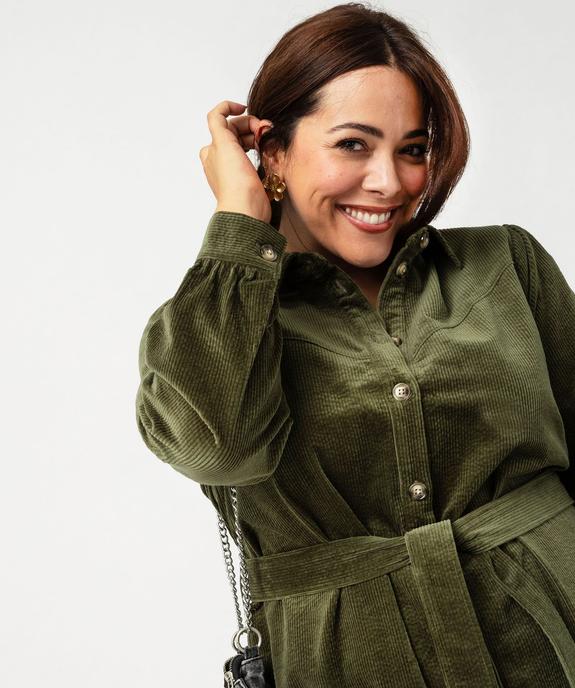 Gémo revisite la robe chemise dans un élégant velours côtelé au coloris chaleureux. Une robe femme grande taille (du 46 au 54) à la coupe droite, avec surpiqûres sur la poitrine, fermée par une rangée de boutons sur l’avant. Elle possède des manches froncées aux épaules et resserrées par un biais boutonné aux poignets. Cette robe en velours possède des finitions arrondies dans le bas et une ceinture à nouer ton sur ton. Elle se porte droite ou ceinturée avec une paire de bottes.