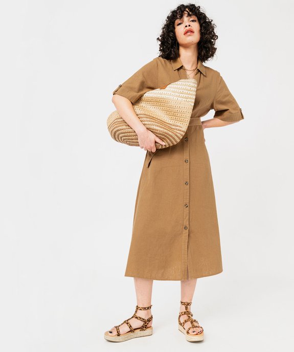 Robe chemise longue à manches courtes en lin et viscose femme marron vif