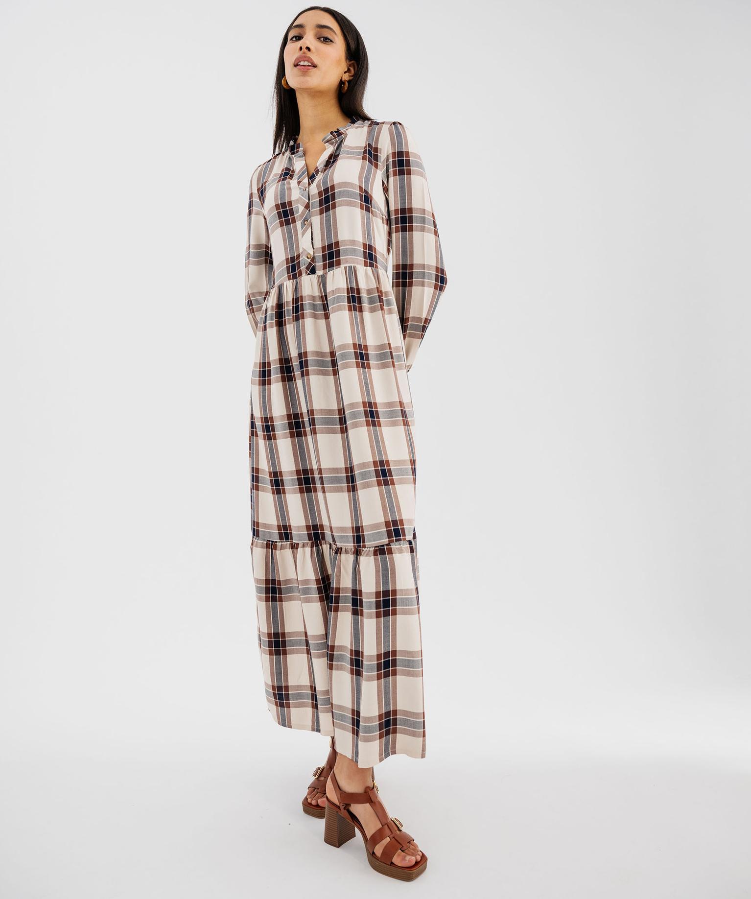Craquez pour cette robe longue fluide, douce et originale ! La robe femme mixe avec brio plusieurs styles ! On note les volants et les fronces romantiques, les carreaux très casual, la matière fluide et les fines rayures dorées ultra sensuelles. La robe possède des manches longues, un volant au col, une élégante boutonnière en écaille imitation et une très confortable taille élastiquée.
