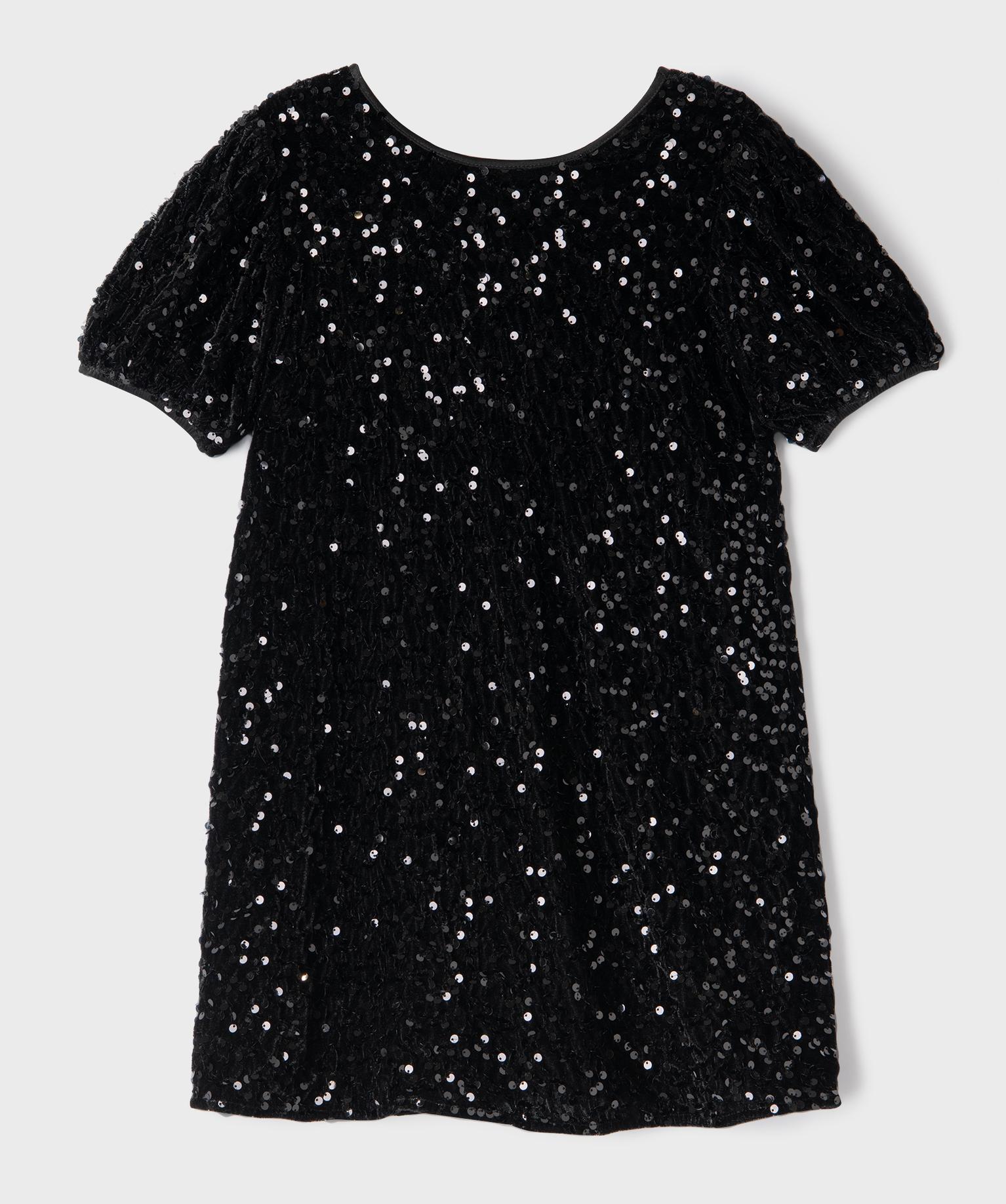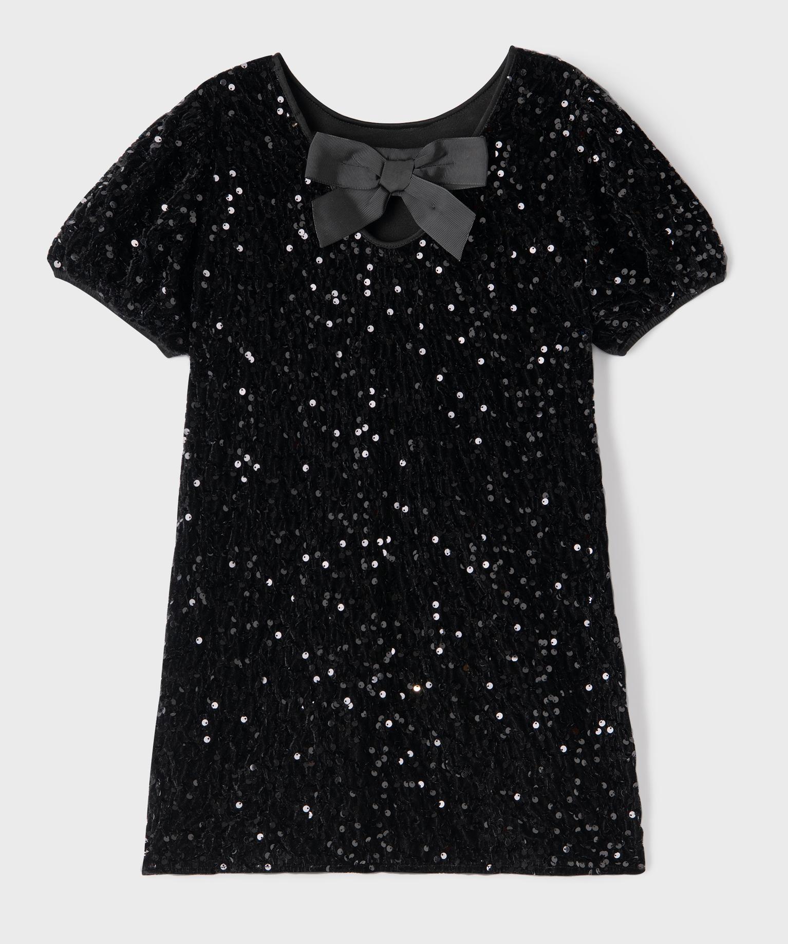 Parfaite pour les fêtes, cette robe courte pour fille brille de mille feux grâce à sa matière velours entièrement rebrodée de sequins scintillants. Sa coupe droite et sa confection élégante et extensible en font une pièce chic et confortable. Les manches courtes ballons, resserrées par un élastique, ajoutent une touche de légèreté. Le dos décolleté se pare d'un grand ruban noué, pour un effet raffiné. Une robe de fête, idéale pour illuminer les plus beaux moments.