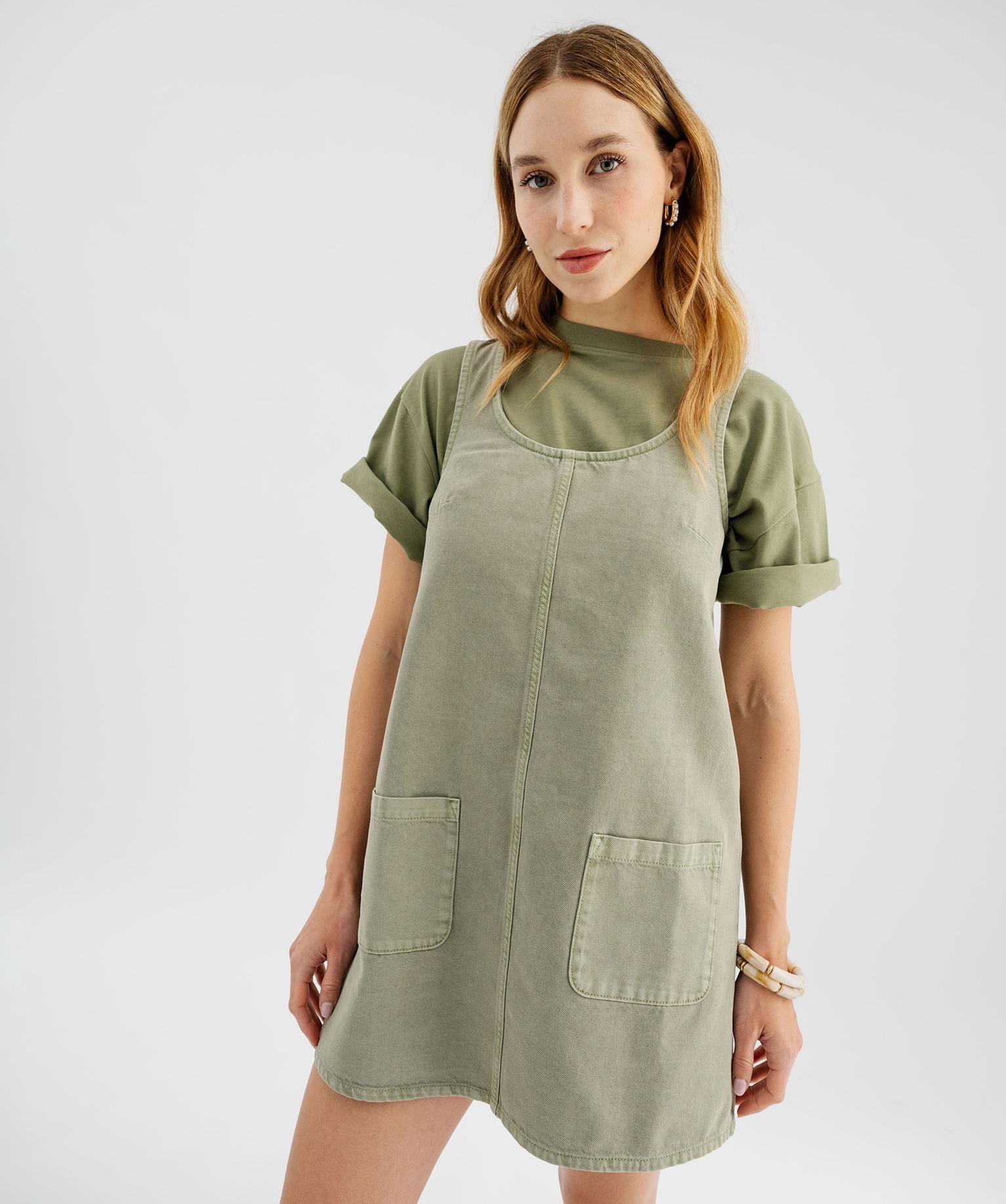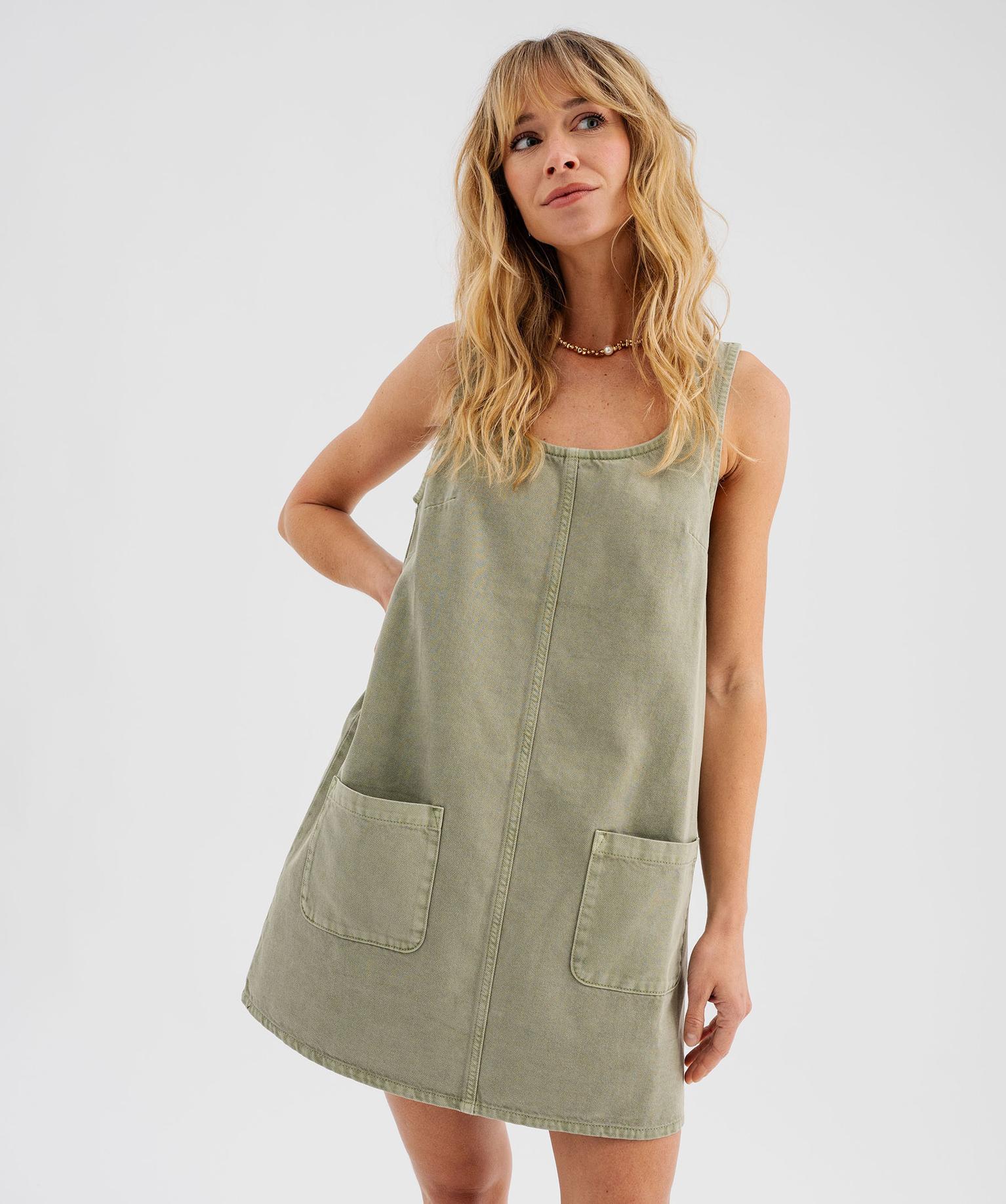 Cette robe femme en toile denim vous promet un look décontracté au top de la mode ! Elle arbore une coupe trapèze pour un effet loose et deux poches plaquées sur l’avant. Une robe courte très féminine grâce à ses pinces poitrine et son large col rond. Elle se porte sur un tee-shirt et avec des tennis en toile en saison estivale, et sur un pull fin avec des bootes en hiver.