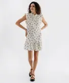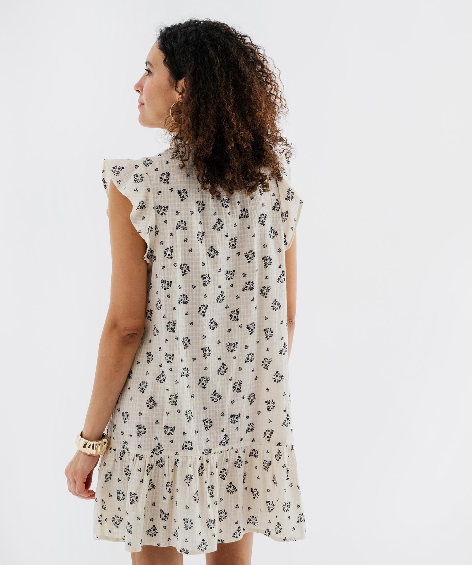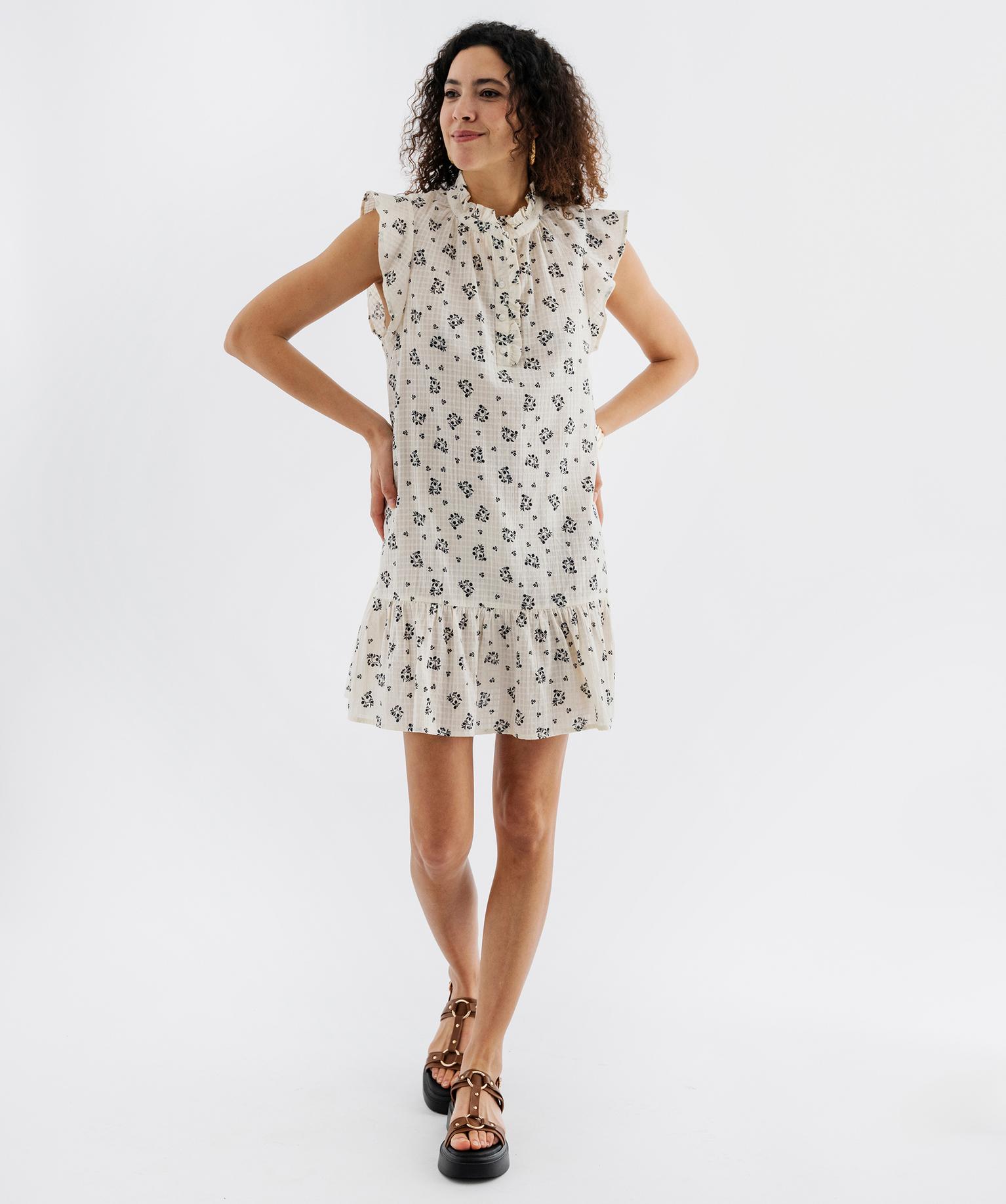 Robe courte sans manches en voile de coton fleuri femme ecru