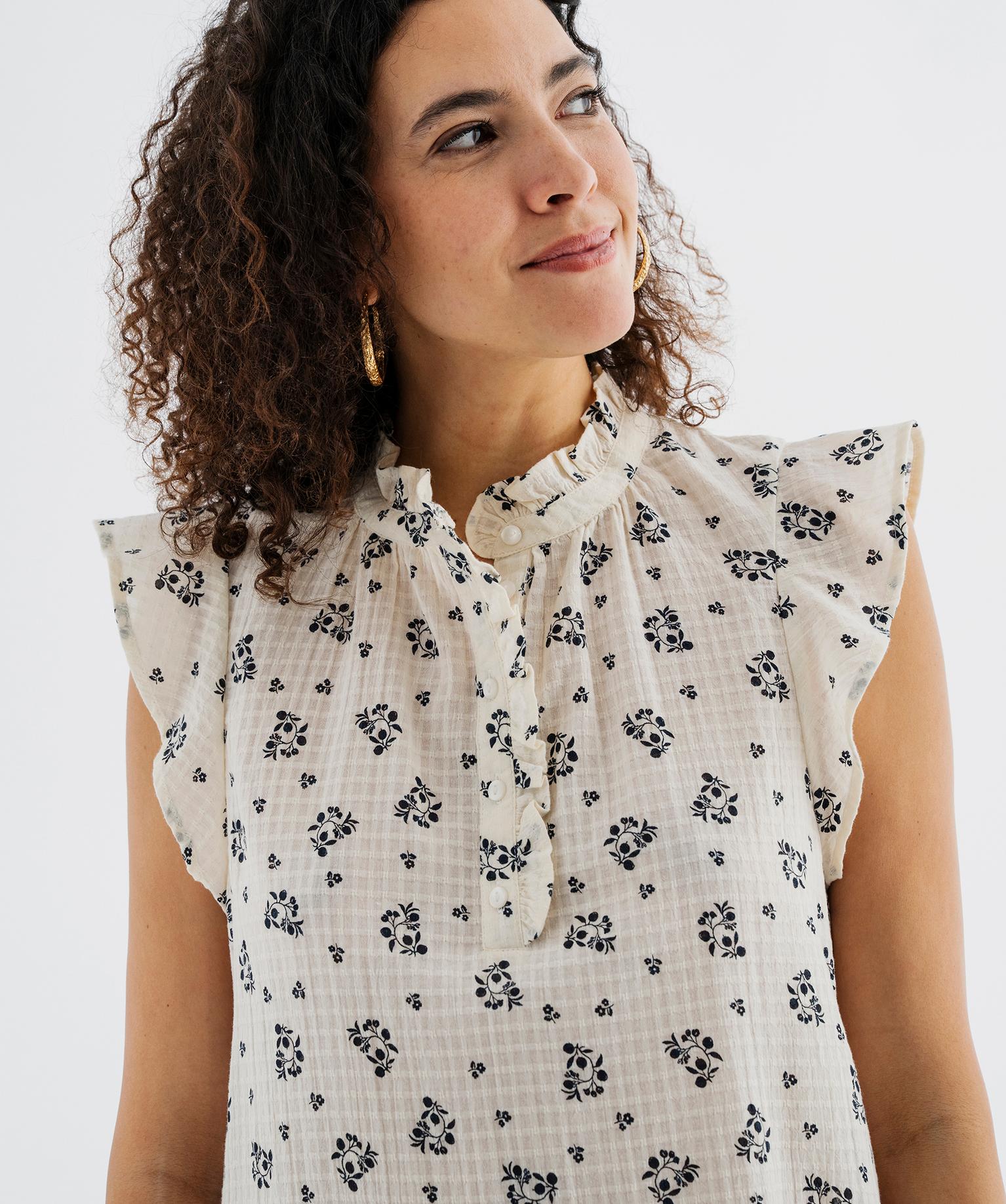 Laissez-vous séduire par le charme délicat de cette robe courte sans manches, pensée pour apporter légèreté et féminité à vos looks d’été. Confectionnée en voile de coton texturé fleuri, cette robe femme offre une ampleur aérienne et une allure subtilement romantique. Son col victorien, ses épaules volantées et sa boutonnière soulignée d’un volant lui confèrent une touche raffinée. Le grand volant du bas apporte du mouvement à chaque pas. Longueur genou, cette robe légère est doublée d’un fond de robe à fines bretelles pour votre confort et une opacité parfaite.