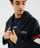 Cette robe de chambre pour homme allie confort et style pour vous accompagner dans tous vos moments de détente. Une robe de chambre Camps United confectionnée en velours avec intérieur en maille peluche ultra douce. Inspirée de l’univers sportif, elle est agrémentée de bandes contrastantes sur les manches, d’une inscription brodée sur la poitrine et d’une large inscription dans le dos. Un peignoir à capuche à fermer tout simplement en nouant la ceinture.