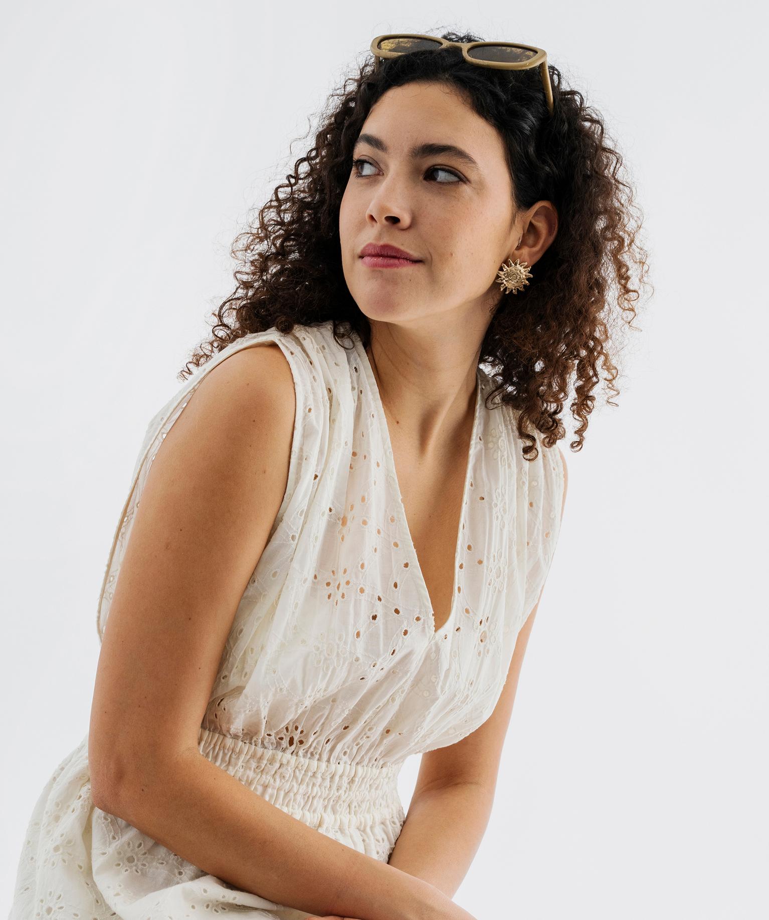 Elle a un charme fou, cette robe de plage sans manches en broderie anglaise ! Glamour, elle présente des emmanchures échancrées et une taille marquée par smocks. Le décolleté V profond à l’avant et à l’arrière souligne élégamment le buste et le dos. Les liens à nouer aux épaules avec pompons assurent un bon maintien de la robe. La partie jupe est doublée en voile de coton. Une robe de plage légère et confortable, idéale pour un look estival bohème chic.