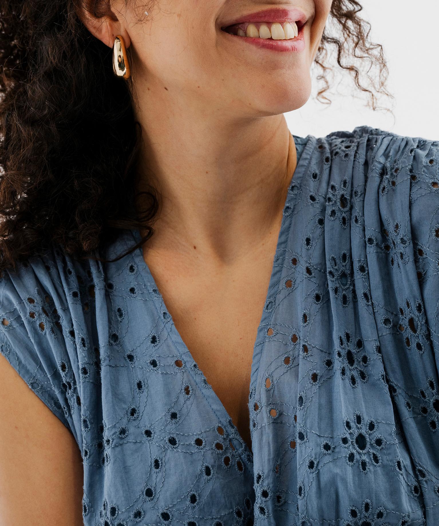 Elle a un charme fou, cette robe de plage sans manches en broderie anglaise ! Glamour, elle présente des emmanchures échancrées et une taille marquée par smocks. Le décolleté V profond à l’avant et à l’arrière souligne élégamment le buste et le dos. Les liens à nouer aux épaules avec pompons assurent un bon maintien de la robe. La partie jupe est doublée en voile de coton. Une robe de plage légère et confortable, idéale pour un look estival bohème chic.