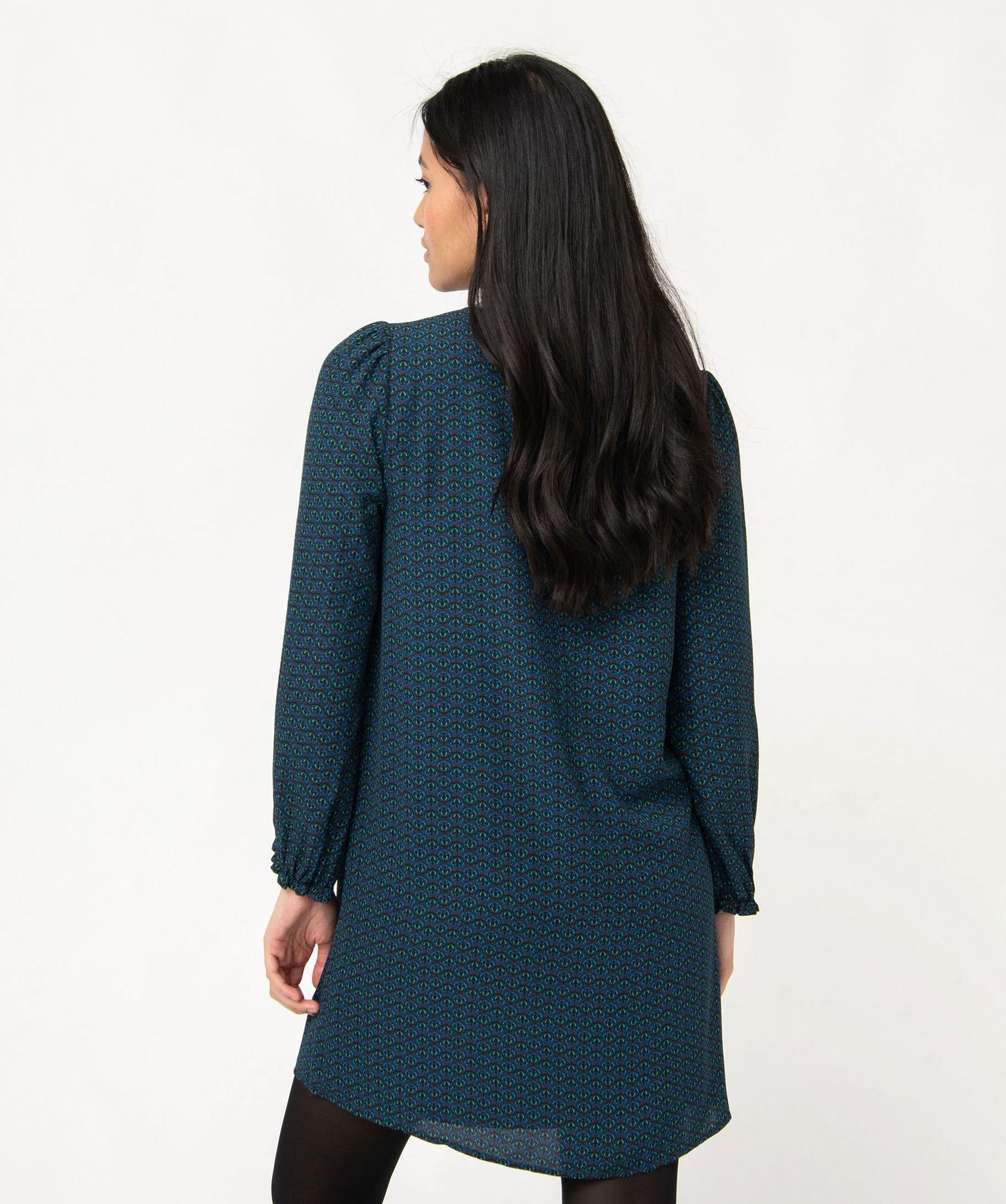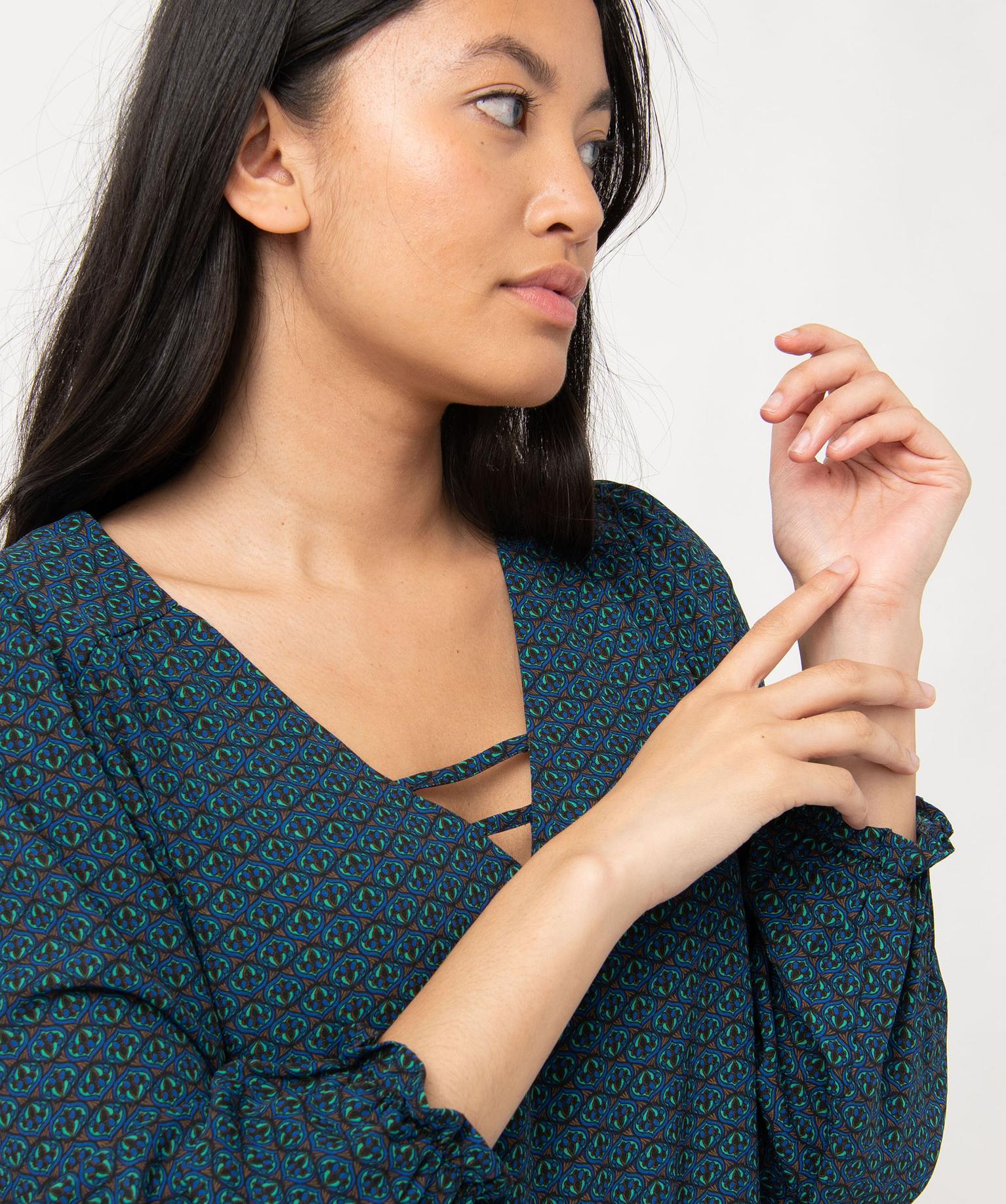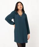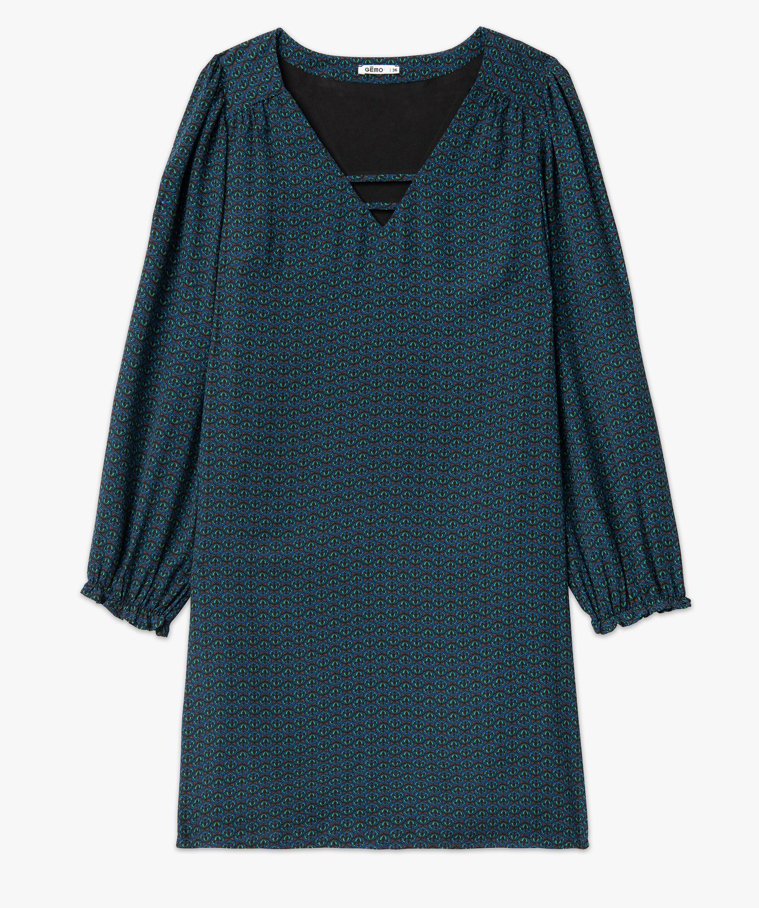 Robe droite imprimée à manches longues et col V fantaisie femme bleu canard