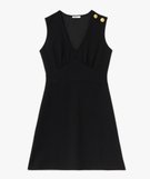 De l'élégance, mais sans compromis sur le confort pour cette robe femme ! Une robe courte, sans manches, avec un décolleté en V et une taille empire très séduisante. Confectionnée dans une maille extensible relativement épaisse, cette robe accompagne tous vos mouvements avec beaucoup d'aisance et un joli tomber. L'épaule gauche est décoré de deux gros boutons dorés d'inspiration marine. Vous porterez cette robe au bureau avec un blazer et des sandales à talon par exemple.