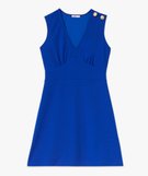 De l'élégance, mais sans compromis sur le confort pour cette robe femme ! Une robe courte, sans manches, avec un décolleté en V et une taille empire très séduisante. Confectionnée dans une maille extensible relativement épaisse, cette robe accompagne tous vos mouvements avec beaucoup d'aisance et un joli tomber. L'épaule gauche est décoré de deux gros boutons dorés d'inspiration marine. Vous porterez cette robe au bureau avec un blazer et des sandales à talon par exemple.