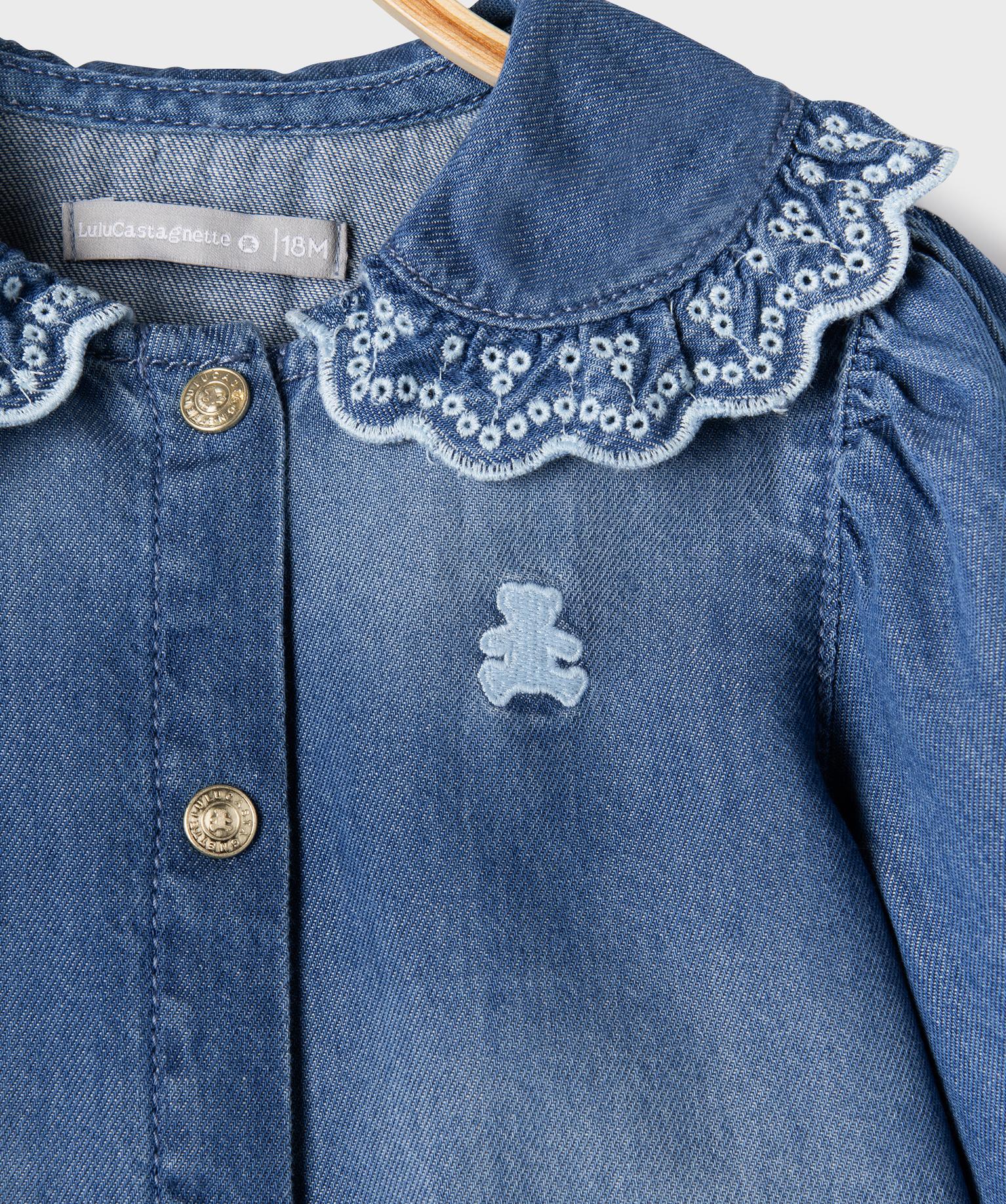 Un véritable concentré de style signé LuluCastagnette pour les premiers looks de saison ! Cette robe bébé fille en denim 100% coton souple revisite le jean avec une touche de douceur et de romantisme. On adore son col Claudine délicatement brodé, ses manches longues légèrement blousantes et froncées aux épaules, ainsi que son bas volanté qui lui donne un joli mouvement. Entièrement pressionnée sur le devant, cette robe en jean se révèle aussi pratique que craquante, avec en prime l’adorable ourson Lulu brodé sur le buste. Parfaite avec un collant côtelé écru, des petites bottines et un gilet en maille douce.