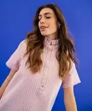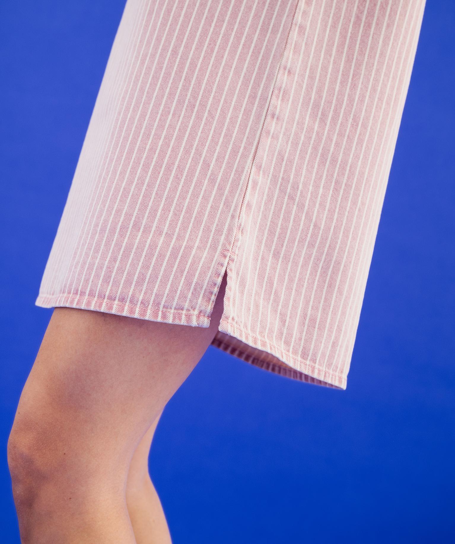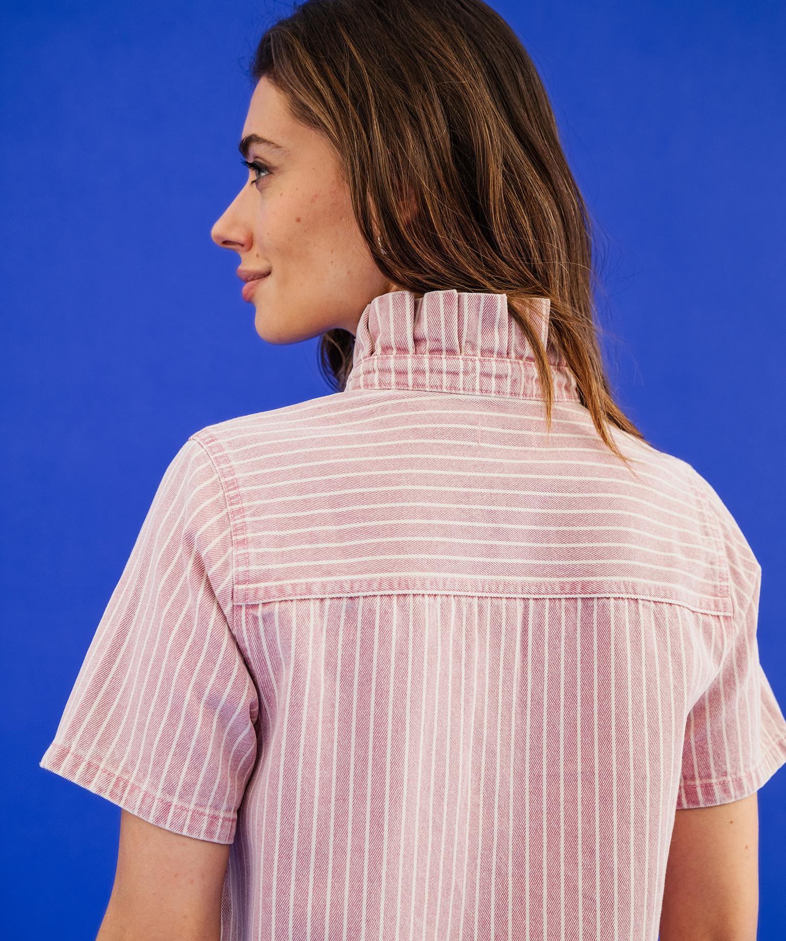 Impossible de passer inaperçue avec cette robe femme au caractère affirmé. Son denim coloré délavé, réveillé par de fines rayures blanches, apporte une touche audacieuse à votre quotidien ! La coupe courte et droite , avec fentes latérales s’inspire de la liquette. On aime sa praticité : manches courtes, boutonnière pressionnée, fentes, denim 100% coton. Le détail qui fait toute la différence reste le col victorien, délicatement rétro, qui féminise la silhouette. Une robe en jean originale et pleine de personnalité à associer aussi bien à des baskets qu’à des sandales.
