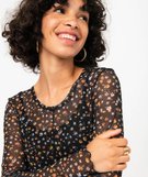 Vous serez immédiatement séduite par la coupe sobre de cette robe à manches longues. Une robe femme confectionnée dans un voile transparent parsemé de petites fleurs multicolores. Pour ne pas être transparente elle est doublée d’un fond de robe à bretelles en maille extensible. Cette robe fleurie possède un col rond et des surpiqûres apparentes sur l’avant, dans le dos et aux emmanchures. Les finitions froncées aux poignets et dans le bas ajoutent une délicate touche glamour. Elle se porte avec des boots et un blouson biker.
