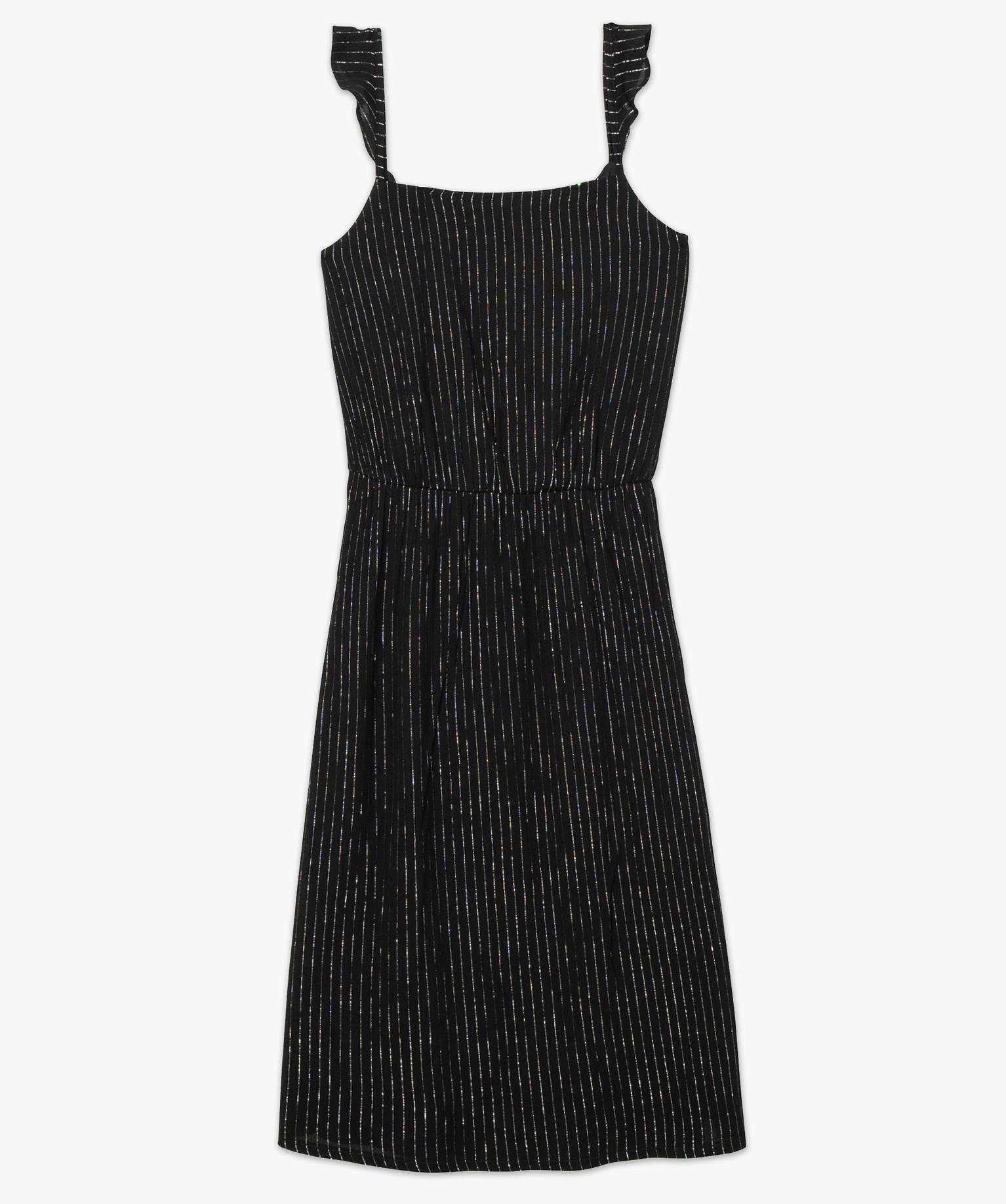 On aime les fines rayures brillantes en fil Lurex de cette robe femme ! La coupe droite est féminisée par une longueur midi tendance, une taille cintrée par élastique et des bretelles subtilement volantées. Côté confort, la robe en crêpe gaufré est entièrement doublée. À porter avec des sandales à brides métallisées.