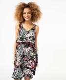 Une jolie petite robe estivale qui met votre féminité en valeur grâce à un double décolleté en V. Cette robe pour femme s’enfile en un clin d’œil et s’adapte à toutes les silhouettes grâce à une ceinture élastiquée. Une robe à motifs exotiques au look ultra coloré à porter avec une paire de sandales plates. Finitions biais sur le col et les emmanchures.