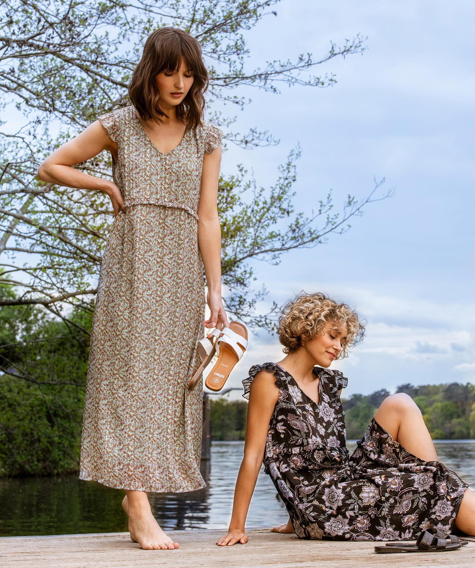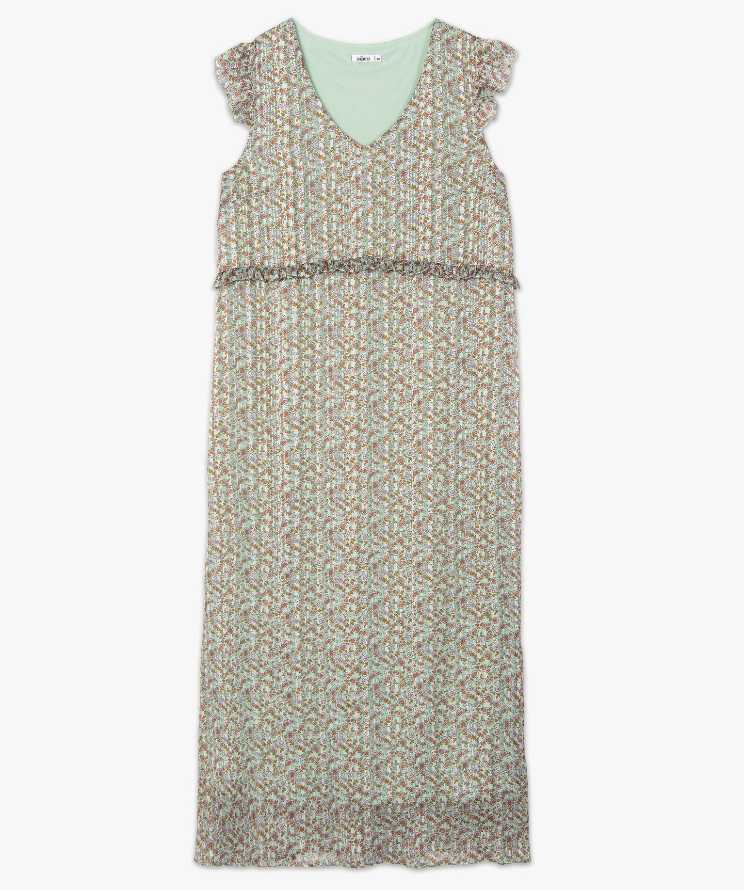 Une très jolie robe longue qui vous accompagnera lors de toutes vos soirées et grandes occasions. Une robe femme ornée de motifs fleuris et parsemée de fines rayures pailletées. Pour encore plus de glamour, cette robe pailletée possède des petits volants sur les épaules et de petites fronces à la taille. Son large col en V permet de mettre votre décolleté en valeur. Une robe de cérémonie à porter avec une paire d’escarpins à talon.
