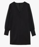 Robe courte idéale pour une allure chic à la fantaisie subtile. La robe femme présente une coupe droite classique et une confection en maille. Le col V est souligné d'une large dentelle ton sur ton. Les manches, longues, sont en voile transparent pour laisser entrevoir la peau. Légèrement bouffantes, les manches se terminent par un bracelet en maille comme la matière principale de la robe. Jouez à fond la carte de l'élégance en portant cette robe de soirée avec des talons très hauts et des accessoires brillants. Pour une cérémonie, troquez les escarpins pour des espadrilles compensées. Au quotidien, mules ou sandales plates et veste en jean lui iront parfaitement.