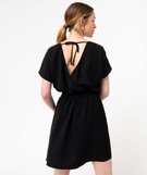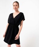 Vous allez adorer le style ultra féminin de cette robe pour femme au double décolleté cache-coeur, avec liens à nouer dans le dos. Une robe unie, confectionnée dans une matière fluide légèrement gaufrée, avec manches courtes et épaules tombantes légèrement froncées. Elle possède une large ceinture élastique et une partie jupe évasée. Une robe courte à porter au quotidien avec une paire de sandales plates, qui se transforme en robe de soirée lorsqu’elle est portée avec des chaussures à talon.