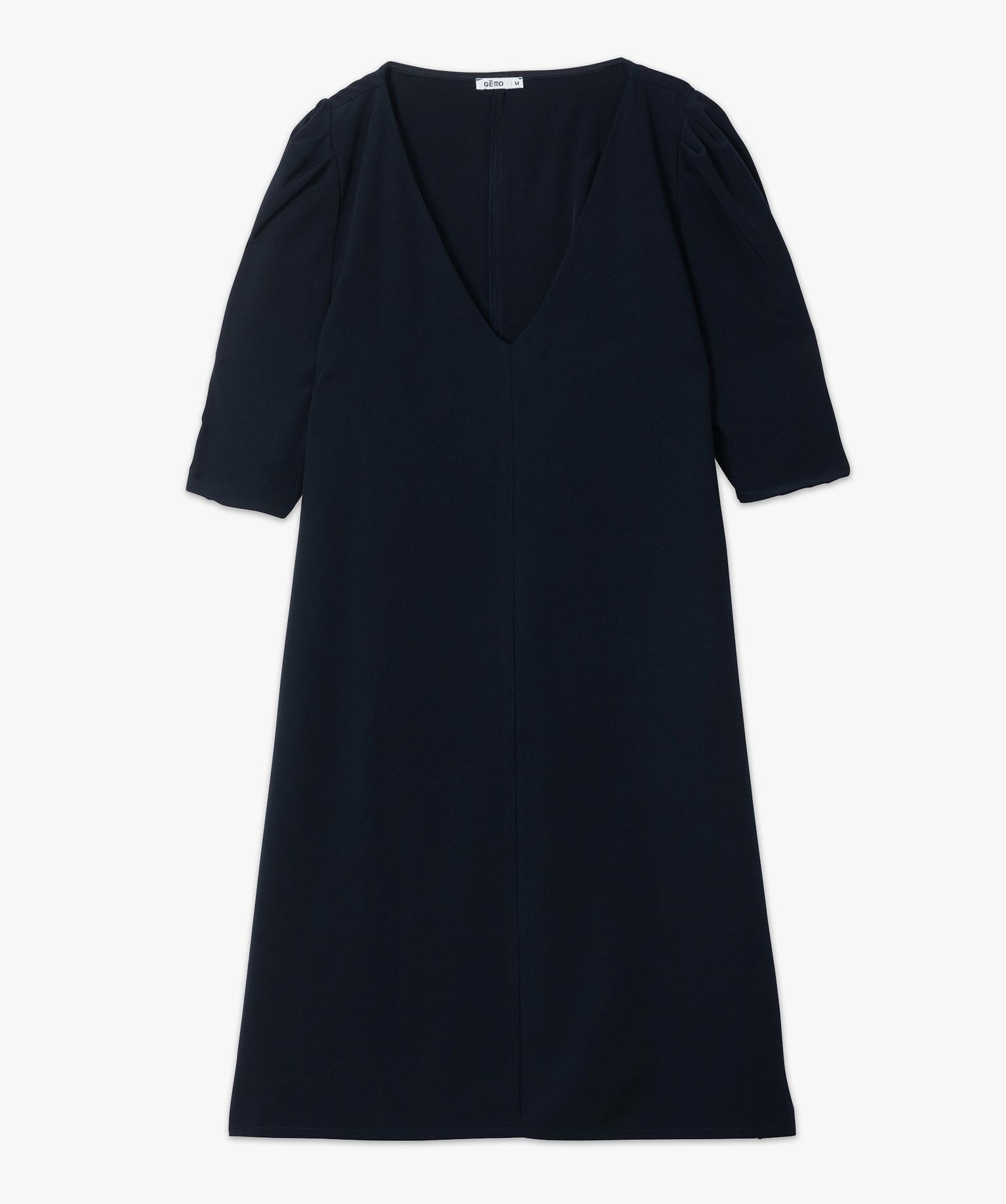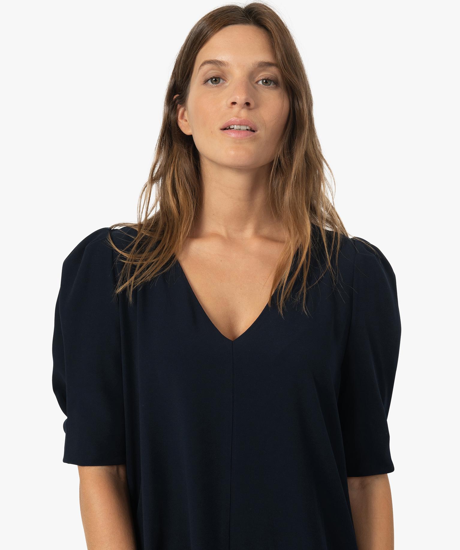 Allure élégante assurée avec cette robe forme trapèze. Une robe femme confectionnée dans une matière fluide aspect crêpe qui offre un bel effet drapé. Cette robe à col V possède des manches courtes effet bouffant avec petites fronces aux épaules. Vous pourrez souligner la taille de cette robe avec une ceinture. Une jolie robe de fête à porter avec une paire d’escarpins à talon.