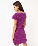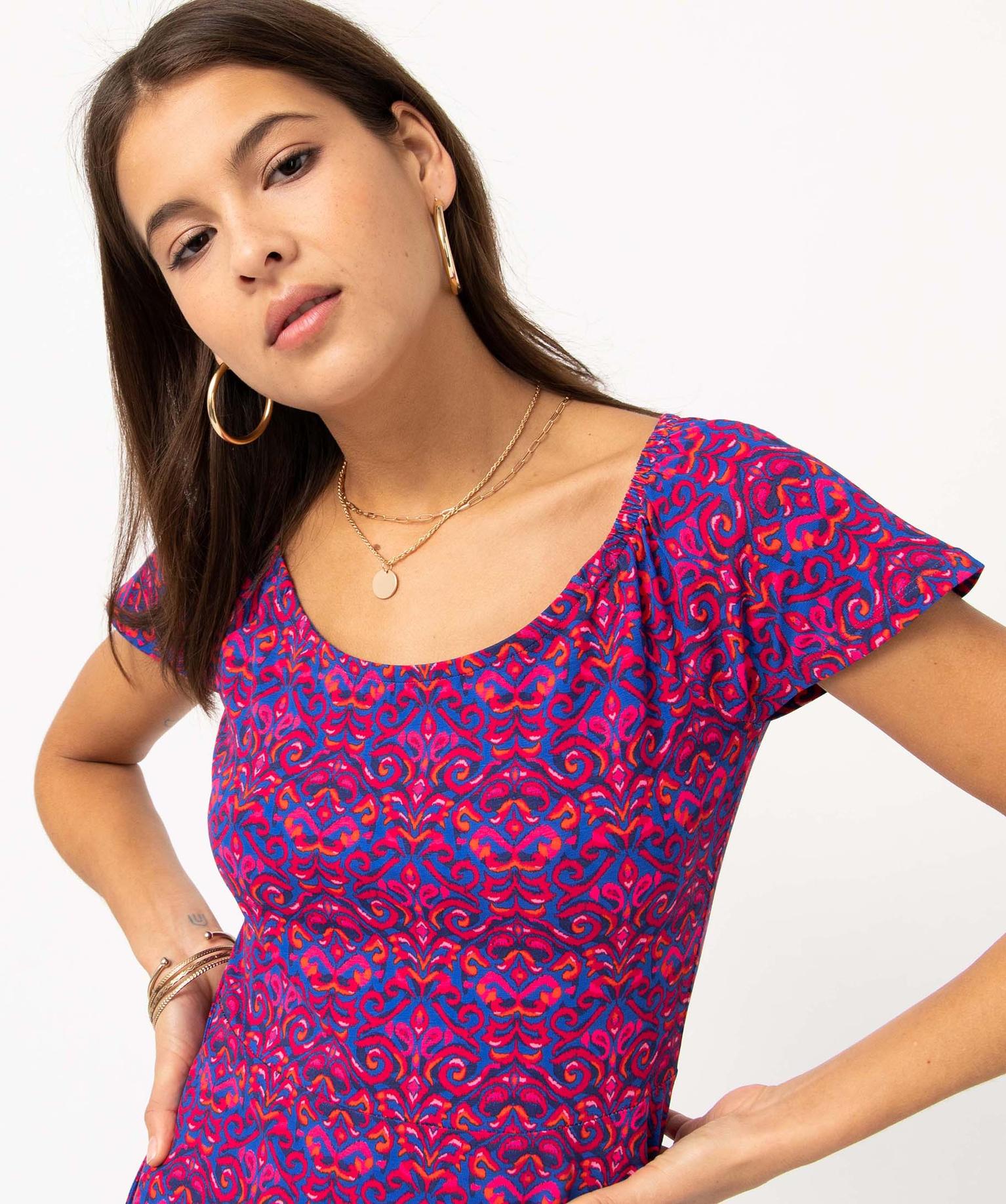 Vous allez tomber sous le charme de cette robe imprimée déclinée dans des couleurs chatoyantes. Une robe à manches courtes avec emmanchures raglan et un col rond élastiqué sur les côté qui peut se porter en col Bardot. Cette robe femme sublime la silhouette par son buste ajusté et sa partie jupe évasée au tombé impeccable. Confectionnée dans un coton extensible, elle offre beaucoup de confort. Une robe courte à porter avec une paire de sandales à talon pour un look pétillant et ultra féminin.