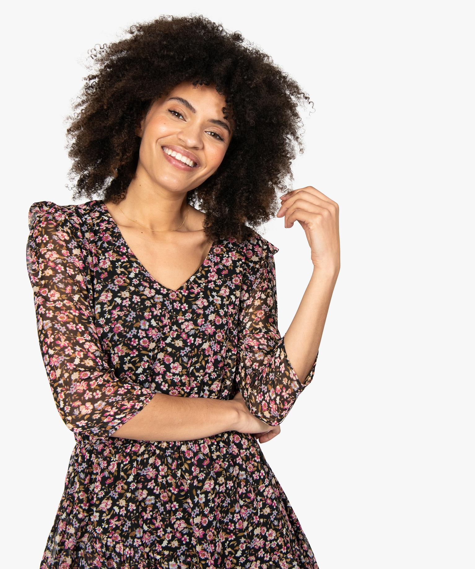 Une robe à manches ¾ qui séduit par ses jolis motifs colorés. Ornée de petites fleurs ou de motifs cachemire en fonction du coloris, cette robe imprimée vous assure beaucoup de féminité. Vous apprécierez le décolleté en V, les manches transparentes avec petit volant sur les épaules et le large volant positionné de manière asymétrique sur la partie jupe. Une robe femme facile à enfiler et très confortable avec sa ceinture élastiquée. Elle se porte avec une paire de sandales à talon ou avec des boots et un blouson court dès l’entrée de l’hiver.