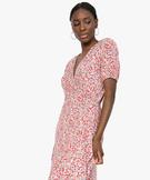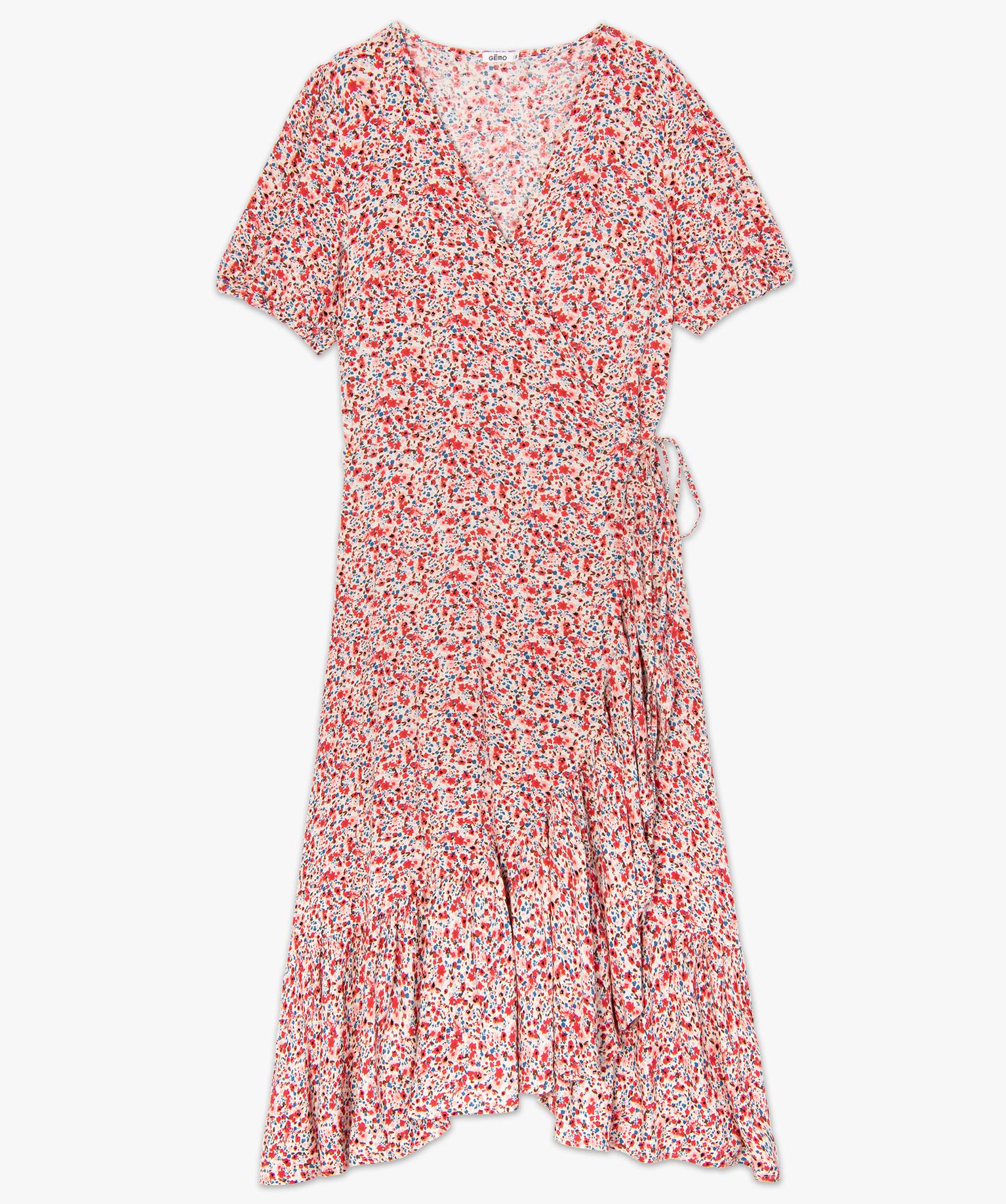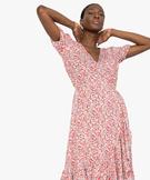 Vous allez adorer cette robe fleurie facile à porter et qui vous assure une allure impeccable en un clin d’œil ! Une robe portefeuille pour femme qui se ferme par une fine ceinture à nouer sur le côté. Elle affiche un large décolleté en V qui valorise la poitrine et des manches courtes resserrées par un élastique. La partie jupe de cette robe longue est ornée d’un large volant pour une allure bohème chic totalement assumée. Facile à porter, elle s’associe aussi bien avec une paire de sandales compensées qu’avec une paire de tennis en toile.