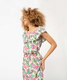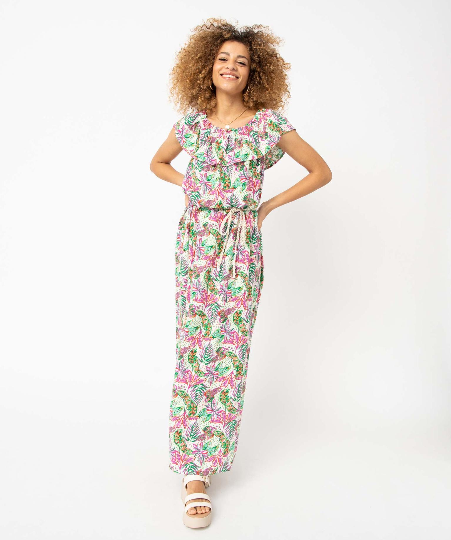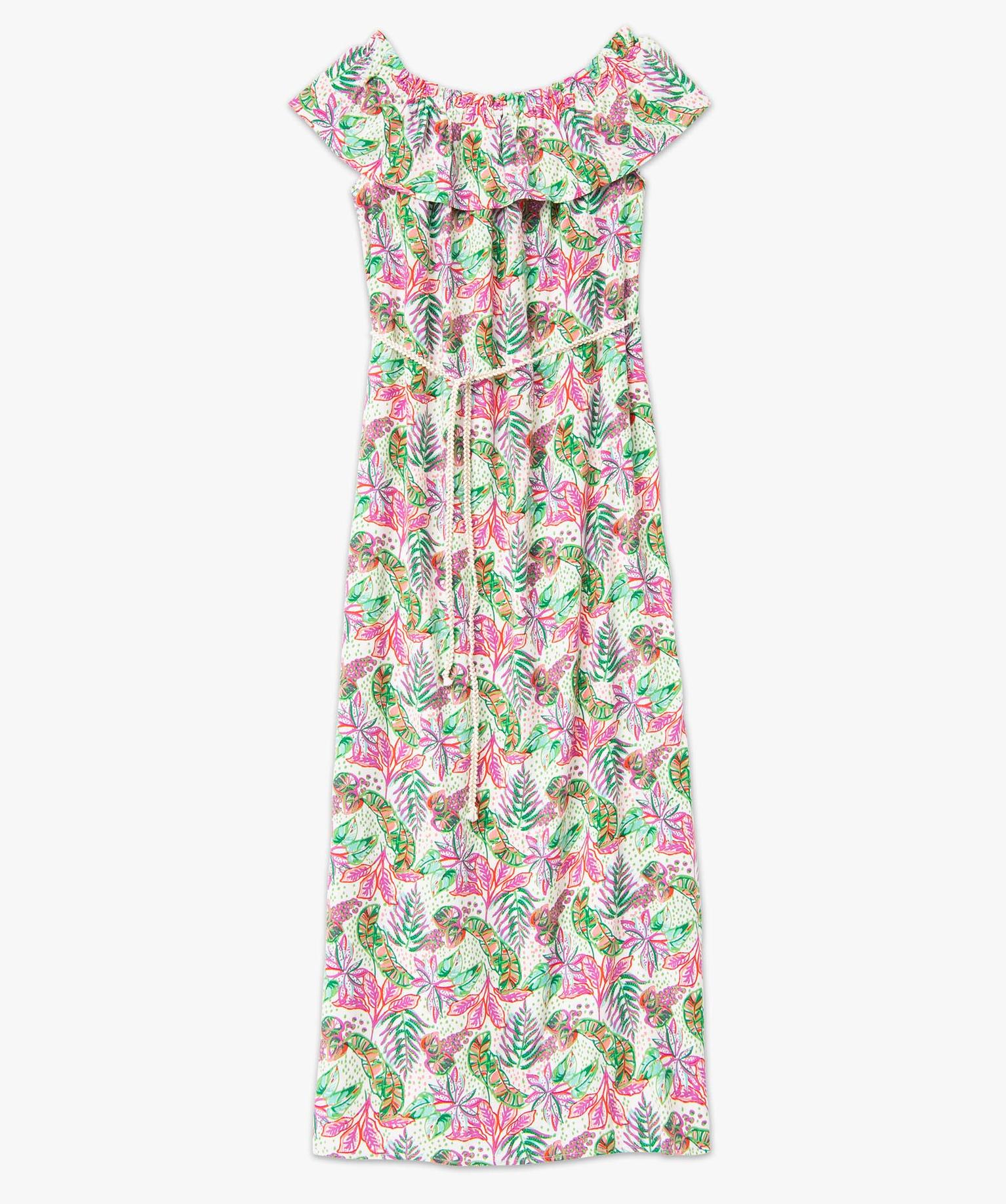 Illuminez votre garde-robe grâce à cette jolie robe longue à motifs fleuris. Une robe femme à col Bardot élastiqué souligné par un large volant qui flotte sur les épaules. Cette robe affiche une coupe ample et confortable resserrées par une fine ceinture tressée incrustée de fil pailleté. Une robe de soirée imprimée fendue sur un côté, confectionnée à partir de fibre Lenzing™ Ecovero™, une fibre écologique produite à l'aide de pulpe de bois issu de forêts durables, certifiées FSC ou PEFC. Une robe colorée à porter avec des sandales brillantes.
