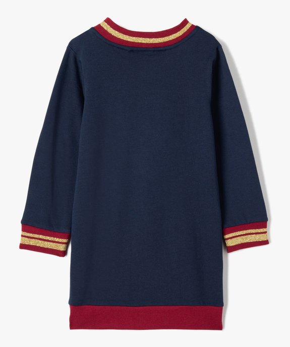 Incroyable robe sweat Harry Potter en jersey molletonné extra doux à l'intérieur. Cette robe fille, en plus d'être confortable, est aussi super stylée avec ses détails : col V et poignets en bord-côte à rayures pailletées, grand imprimé vif d'or imprimé et initiales d'Harry Potter en sequins dorés. On aime aussi son look bicolore devant, uni au dos. Une robe courte à manches longues à porter avec un legging ou des collants et des baskets.
