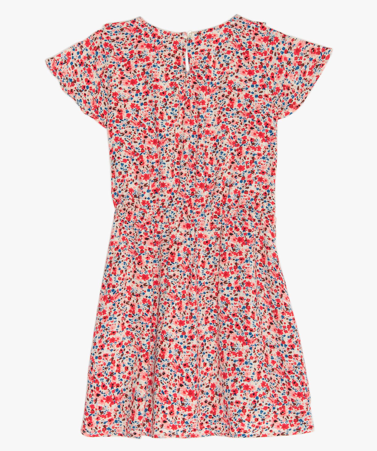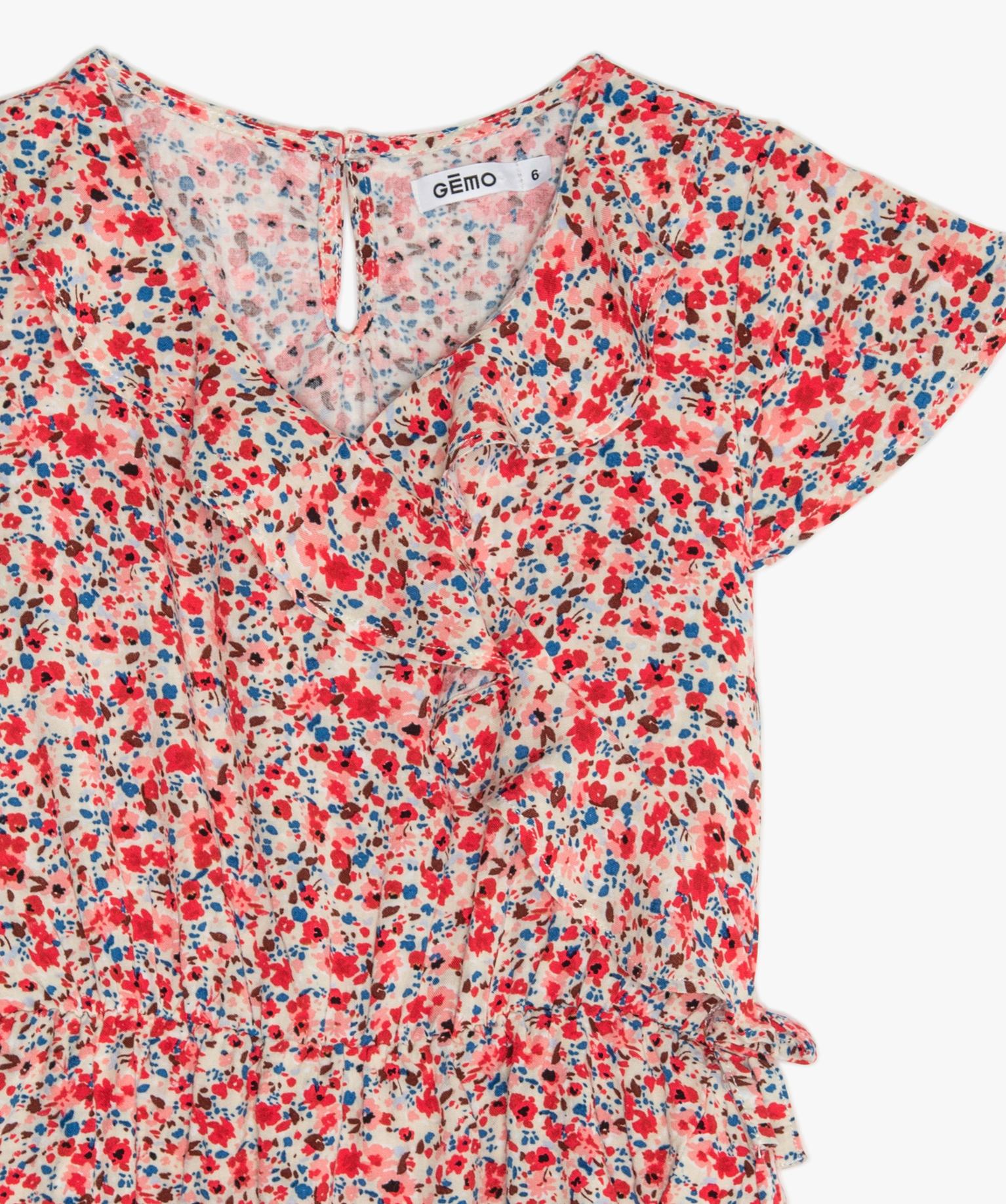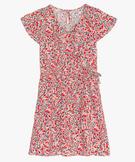 Adorable robe pour fille qui imite le style portefeuille avec son pan sur l’avant et son encolure bordée d'un petit volant, avec nœud décoratif sur le côté. La taille de cette robe courte est marquée par un élastique confortable. Cette robe fleurie possède des manches très courtes et se ferme dans le dos par bouton avec ouverture goutte. Une robe pétillante à porter avec des sandales à brides.
