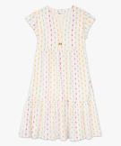 Cette jolie robe bohème va égayer votre dressing estival ! La robe femme grande taille (du 46 au 54) est confectionnée dans un voile fin et léger, rebrodée de fils multicolores pour une touche bohème, ethnique et moderne à la fois. Elle affiche une jolie encolure avec fente à nouer par des cordelettes... ou à laisser tel quel pour mettre en valeur votre décolleté. La partie jupe bien ample est en volants. Une robe à manches courtes à porter avec des sandales à brides en cuir. Corps et jupe doublés. Cordelettes terminées par 2 perles.