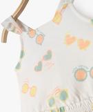 Une très jolie petite robe d’été à ajouter dans le vestiaire des petites princesses. Décorée de lunettes de soleil aux couleurs vitaminées, elle est parfaite pour le plein été. Une robe bébé fille dont les bretelles sont agrémentées de petits volants qui flottent sur les épaules et forment un V dans le dos. La taille élastique est ornée de petites fronces pour une allure toujours plus girly. Elle se porte avec une paire de sandales et un joli chapeau.