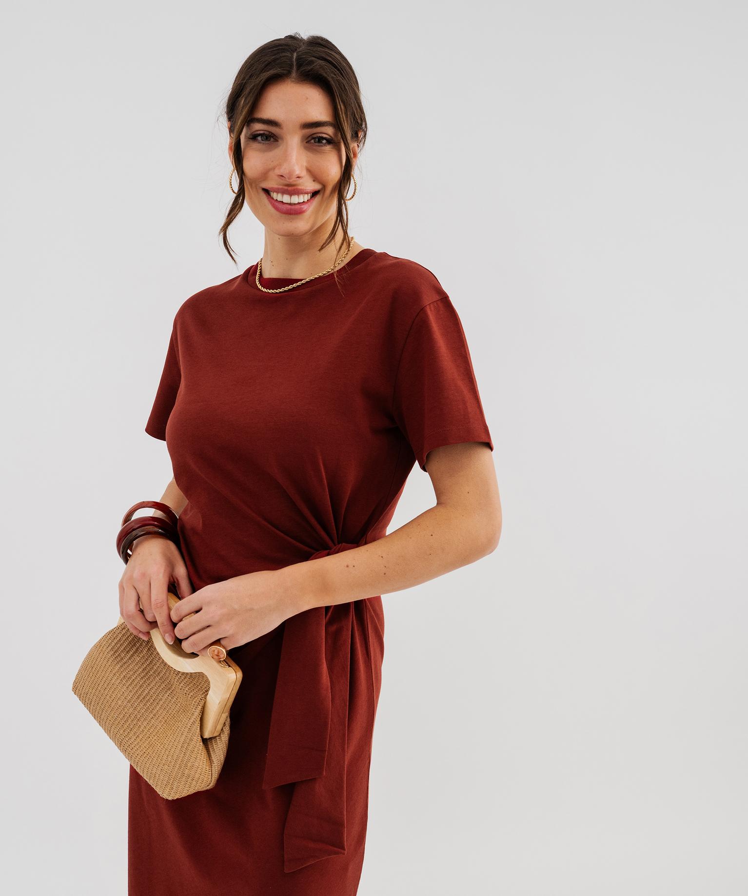 Adoptez un look décontracté et féminin avec cette superbe robe tee-shirt ! Confectionnée en jersey de coton épais, elle est parfaite pour un style moderne et sans effort. Sa coupe droite et sa belle longueur vous assurent une silhouette flatteuse, sans être trop moulante. Pour la touche chic, la robe femme est orné de deux liens à nouer sur la hanche, créant un léger drapé. Facile à porter au quotidien, cette robe manches courtes se marie aussi bien avec des tennis en toile que des spartiates.