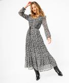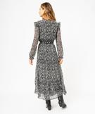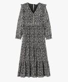 Adoptez un look boho cet hiver avec cette incroyable robe longue pour femme ! Une robe à manches longues, confectionnée dans un voile fleuri structuré par des volants aux épaules, 3 plis plats à la taille, des poignets élastiqués pour un effet blousant, des empiècements volants au niveau de la jupe et un sublime décolleté en V souligné d'un passepoil doré. Pour votre confort, la robe est doublée (sauf aux manches) et dotée d'un petit bouton avec fente en haut du dos. Smocks à la taille dans le dos pour le confort.