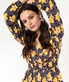 Cette jolie robe longue à motifs fleuris permettra de sublimer votre silhouette. Dotée d’un décolleté cache-coeur qui valorise la poitrine, cette robe pour femme possède des manches longues froncées aux épaules et resserrées par un élastique aux poignets. Une robe fleurie très confortable, confectionnée en viscose fluide et resserrée par une large ceinture smockée. Elle se porte le jour comme le soir avec des sandales plates ou des escarpins à talon.