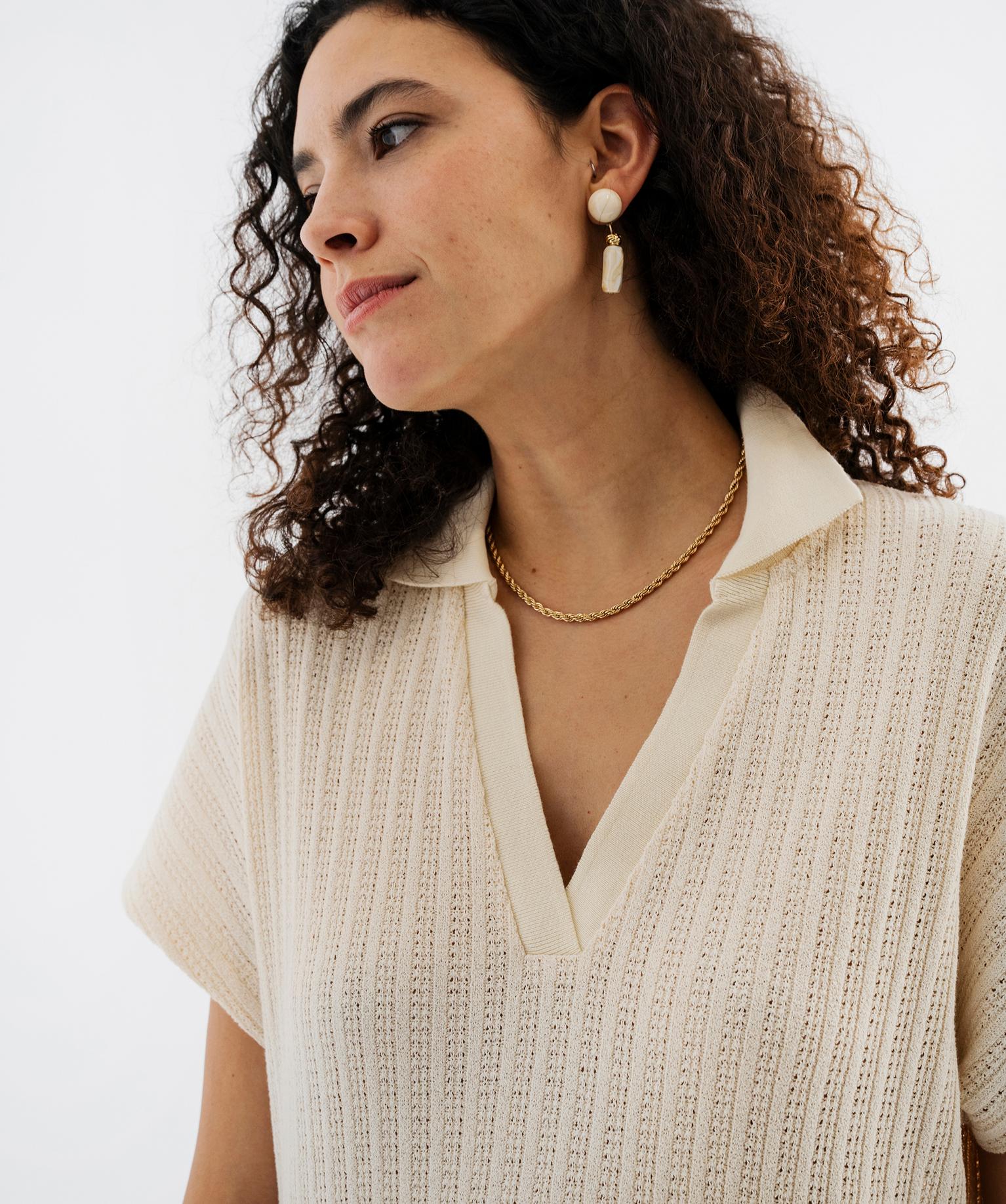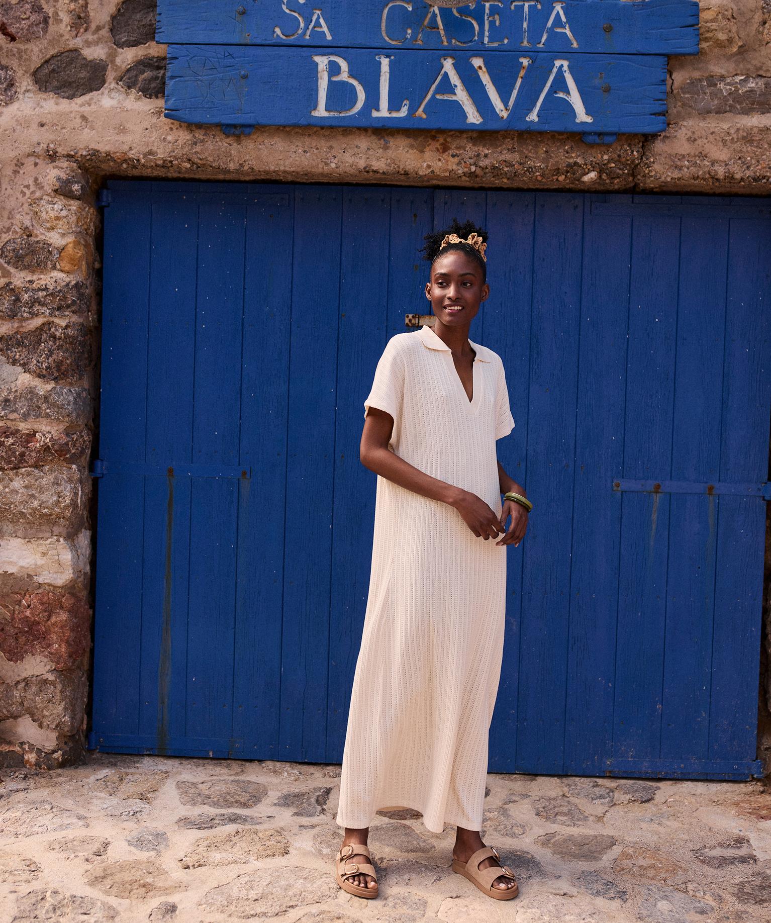 Robe longue col polo en maille fantaisie ajourée femme - LuluCastagnette ecru