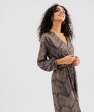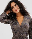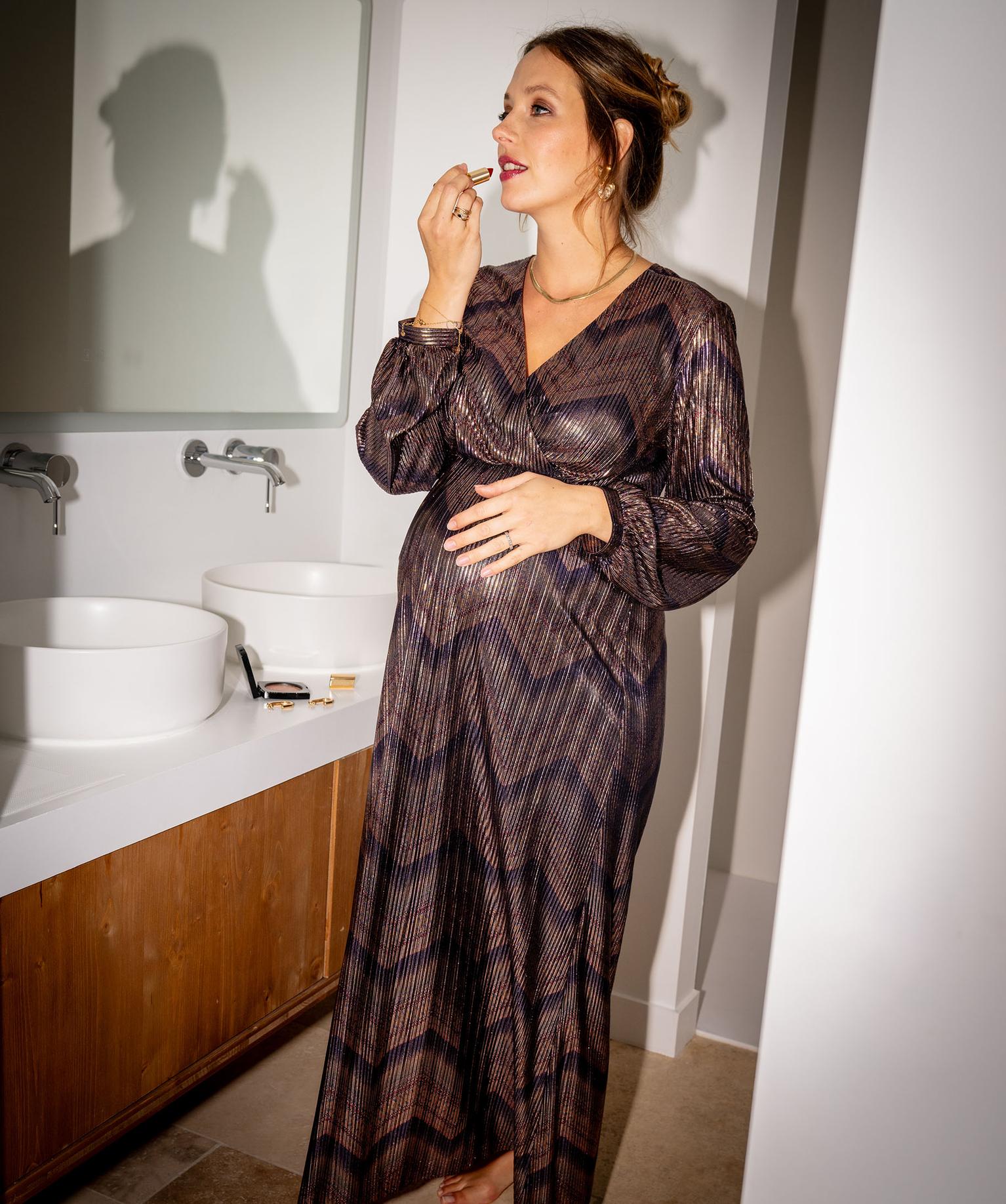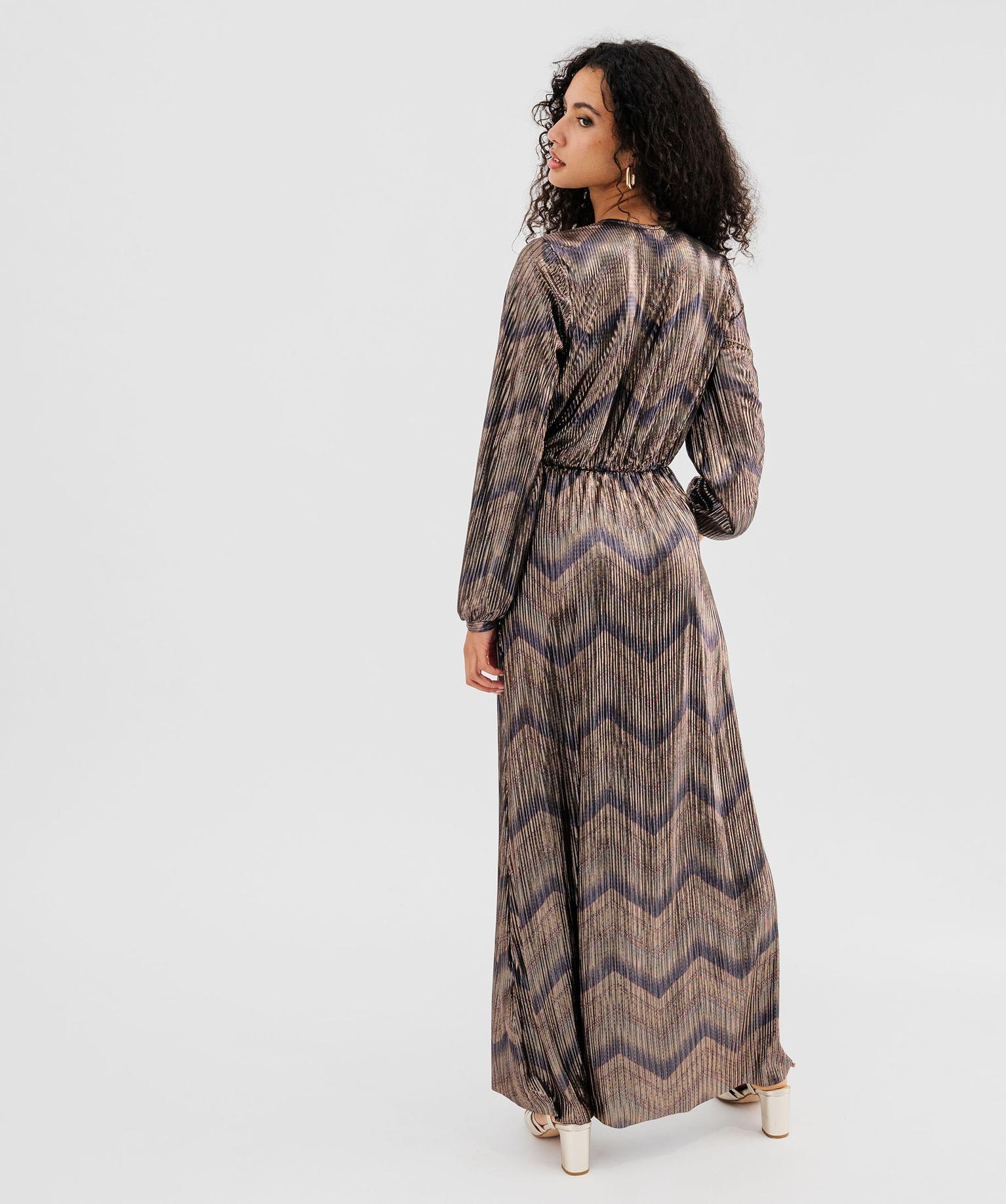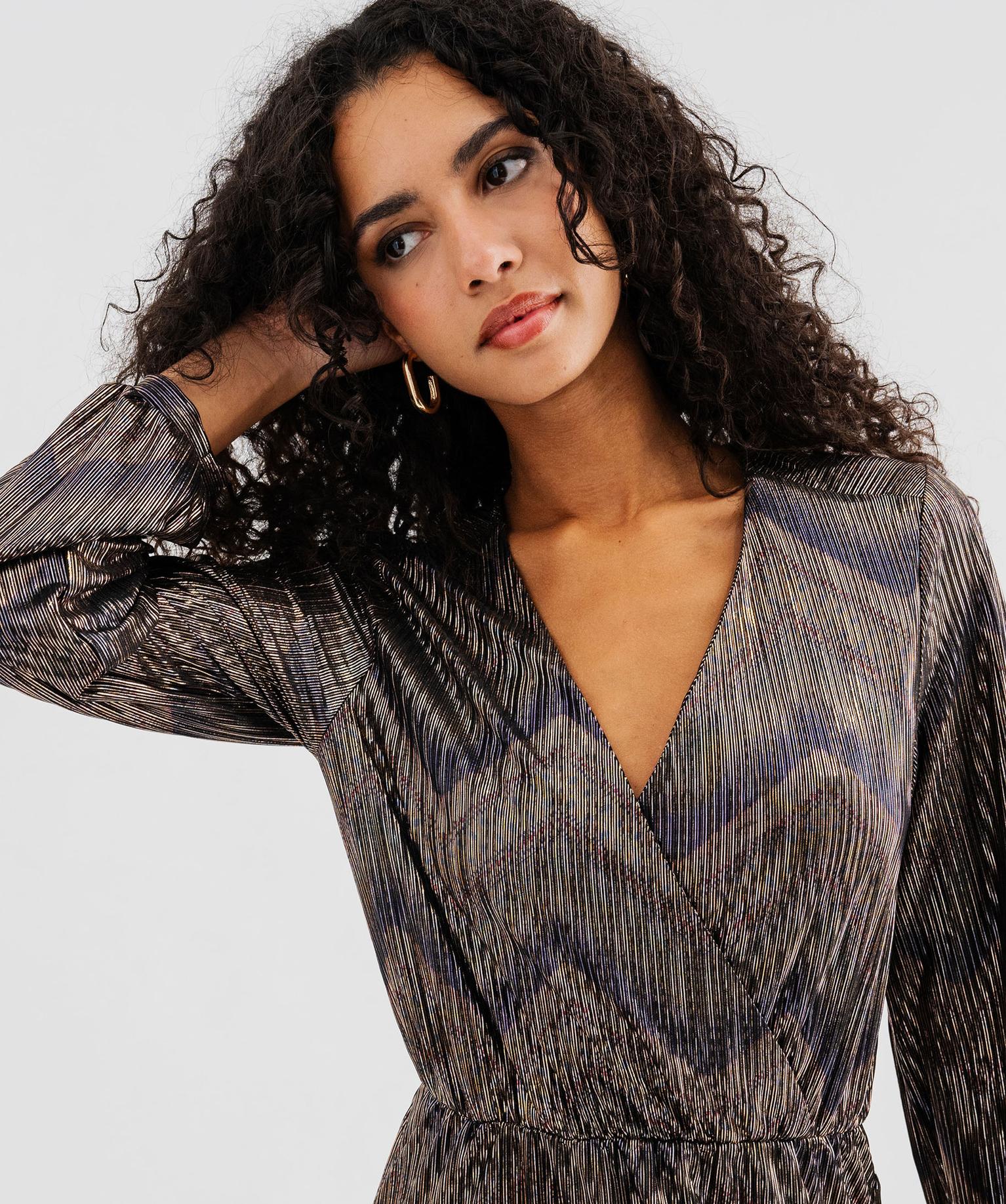 Élégante et sophistiquée, cette robe longue en maille plissée métallisée est la tenue idéale pour briller lors des grandes occasions ou des fêtes de fin d’année. Dotée de manches longues et d'un élégant décolleté cache-cœur, cette robe femme arbore une jupe fluide longueur chevilles. Sa matière métallisée aux reflets chatoyants, mêlée à des motifs géométriques subtils, lui confère un effet visuel captivant et sophistiqué. Les manches amples, finement resserrées aux poignets, ajoutent une touche de raffinement supplémentaire. Pour une allure inoubliable, associez cette robe de soirée à des escarpins à talon et une pochette assortie. Finitions sans coutures dans le bas.
