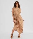 Alliant confort et élégance, cette robe longue sera votre alliée idéale pour la saison estivale. Confectionnée dans une viscose fluide, cette robe femme offre une sensation de légèreté et de douceur. Son joli décolleté en V sublime le port de tête, tandis que ses larges manches courtes, délicatement froncées aux épaules, ajoutent une touche féminine et raffinée. Pratique et flatteuse, elle se ferme à l’avant par une rangée de petits boutons et s’adapte parfaitement à votre silhouette grâce à son élastique discret au dos et sa ceinture à nouer. Une robe imprimée facile à porter en toute occasion, avec une paire de baskets pour une allure décontractée ou avec des sandales à talon pour un style plus sophistiqué.