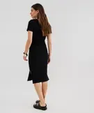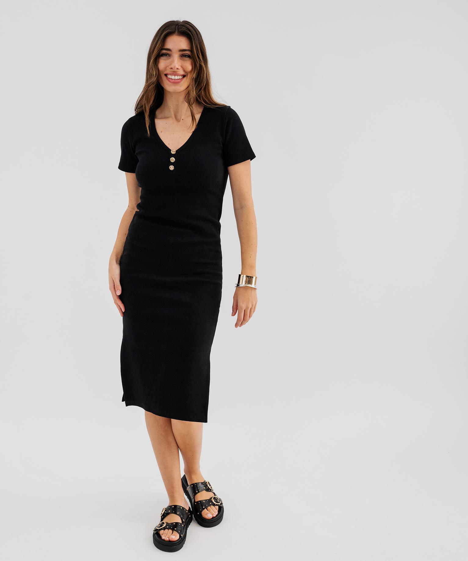 Cette robe longue ajustée près du corps est réalisée en maille côtelée de coton stretch pour un confort optimal. Moulante mais agréable à porter, elle est dotée de grandes fentes latérales qui facilitent les mouvements. Ses manches courtes et son magnifique décolleté en V apportent une touche féminine affirmée, sublimée par trois petits boutons dorés en métal martelé. À la fois cool et élégante, cette robe femme met en valeur la silhouette tout en conservant une allure moderne, idéale pour les journées comme pour les soirées d’été. Couture milieu dos.