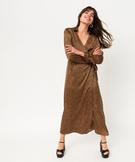 Ajoutez une touche d’audace dans votre garde-robe avec cette sublime robe longue à motif léopard. Une robe portefeuille confectionnée dans une maille satinée ultra douce, offrant de subtils reflets. Cette robe femme est dotée d’un col chemise et d’un décolleté cache-coeur fixé par un bouton à l’intérieur et des liens à nouer à la taille. La partie jupe offre une grande aisance de marche grâce à ses deux pans croisés. Une robe élégante à porter au quotidien avec une paire de basket ou comme robe de soirée avec des escarpins à talon. Ceinture élastiquée au dos. Pli creux dans le dos. Poignets fermés par un bouton.