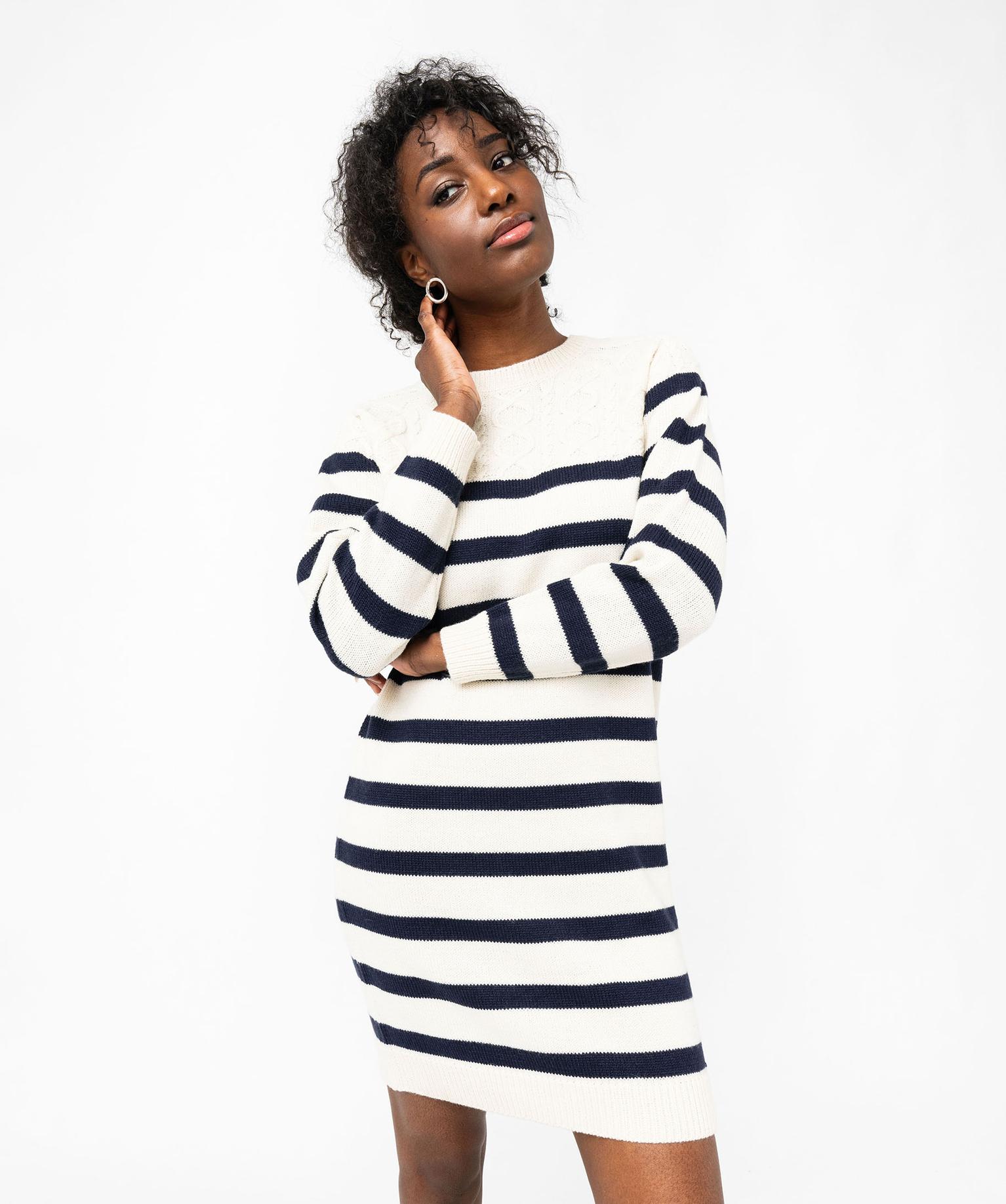 Retrouvez tout l’univers féminin de LuluCastagnette à travers cette jolie robe pull. Une robe femme, avec rayures d’inspiration marine, avec empiècement torsadé sur la partie haute du buste. Une robe courte à manches longues tricoté dans une maille douce contenant de la laine pour offrir une chaleur réconfortante. Elle se porte avec des derbies ou des bottes. Col rond. Emmanchures raglan.