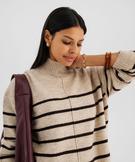 Pièce phare du vestiaire hivernal, la robe pull s’affiche dans une version originale ornée de rayures horizontales. Un modèle parfait pour affronter les journées fraîches avec décontraction. Dotée d’un col montant qui enveloppe joliment le cou, cette robe pour femme mise sur une maille douce contenant de la laine pour garantir chaleur et confort. Ses rayures contrastées apportent une touche graphique, tandis qu’une couture verticale en relief ajoute une touche de modernité. Elle arbore une coupe droite convenant à toutes les silhouettes. Facile à accessoiriser avec une ceinture, des bottes ou une veste en cuir, cette robe courte s’impose comme un incontournable du dressing d’hiver.