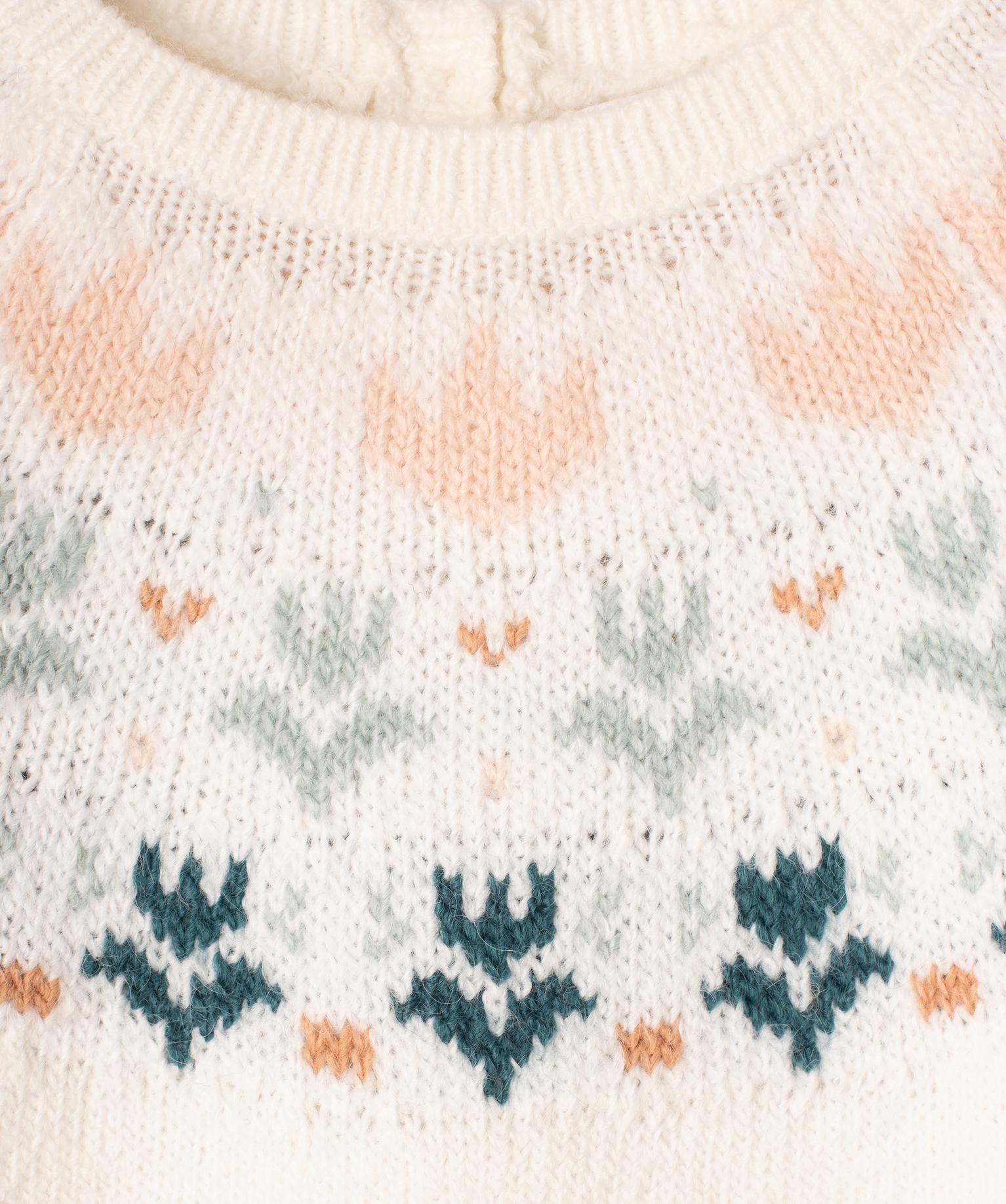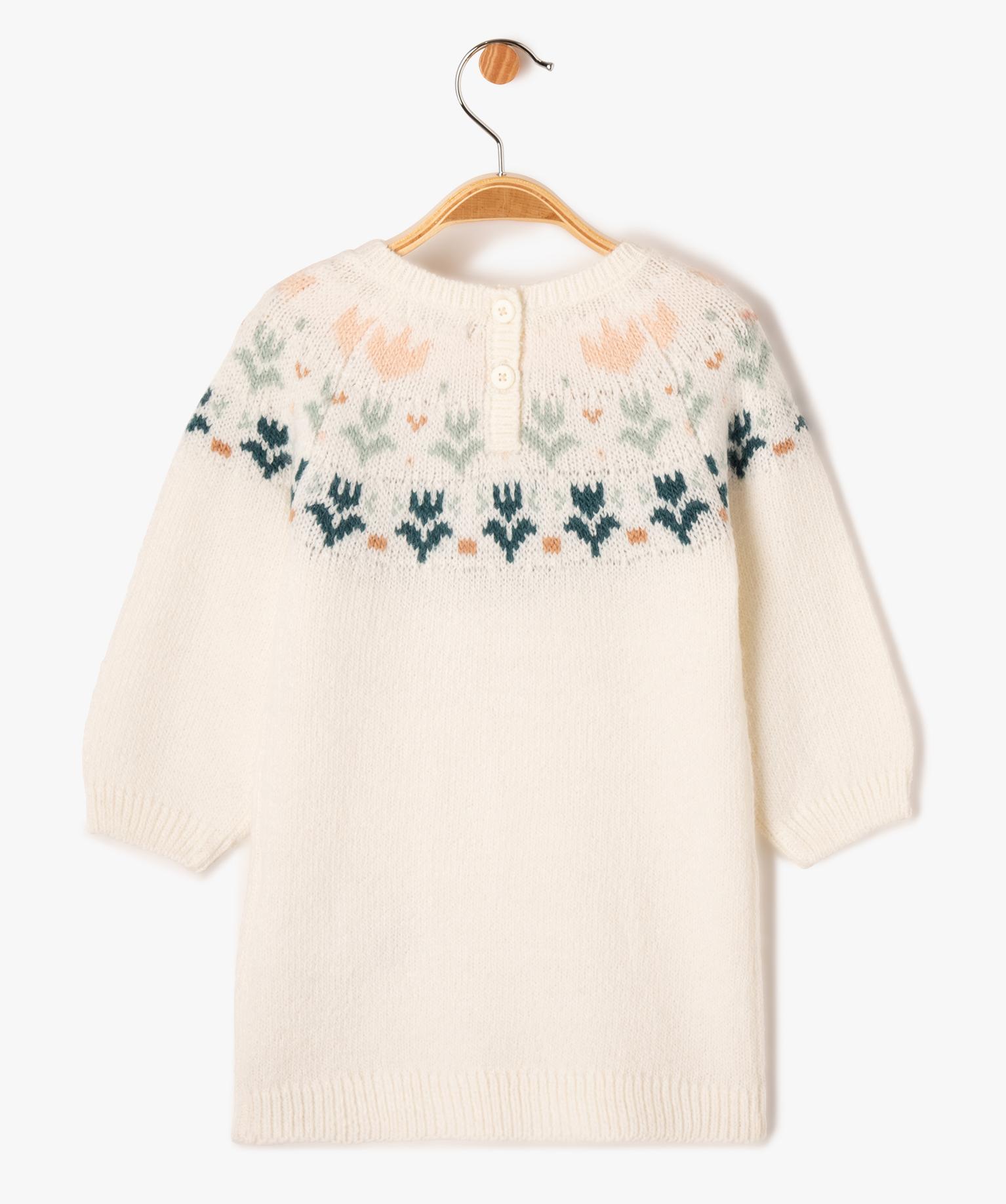 Cette robe pull pour bébé fille affiche une allure casual et romantique à la fois. Elle est fabriquée dans une grosse maille douillette avec un motif jacquard fleuri au niveau de l'encolure. On apprécie les manches raglan, très confortables, ainsi que la boutonnière dans le haut du dos pour laisser plus de place au passage de la tête. Cette adorable robe pull bien chaude se porte idéalement avec des collants épais et des boots. Vous pourrez également l'associer à un legging ou un pantalon en maille skinny. Finition bord-côte au col, aux poignets et dans le bas.