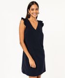Sublimez votre silhouette en toute simplicité grâce à cette robe droite au coloris intemporel, avec encolure en V, agrémentée de petits volants sur les épaules qui descendent dans le dos. Une robe femme confectionnée dans une maille fluide, avec pinces poitrine, offrant un tomber impeccable. Cette robe sans manches à l'allure classique se distingue par une large ouverture dans le dos. Elle se porte avec des sandales plates le jour et des escarpins à talon le soir. Fermeture par bouton dans le haut du dos. Dos élastiqué.