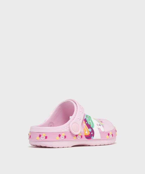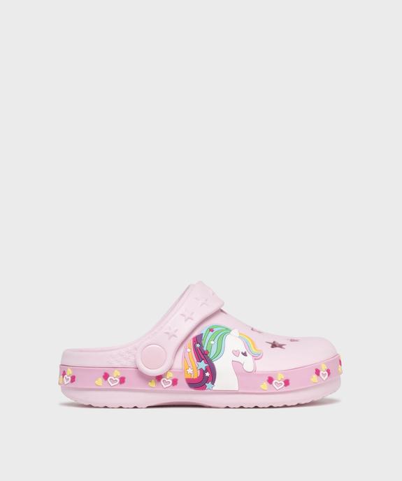 Adoptez le sabot souple, incontournable accessoire à la belle saison ! Facile à chausser, facile à retirer, il reste bien en place à chaque pas grâce à sa bride mobile. Ces sabots pour fille se distinguent par leur confection souple et légère, mais surtout par leur incroyable motif girly en relief avec licorne, cœurs et perforations en étoile. Une chaussure de plage idéale pour protéger le pied jusqu’au bord de l’eau. Chaussure non doublée. Semelles extérieure et intérieure antidérapantes.