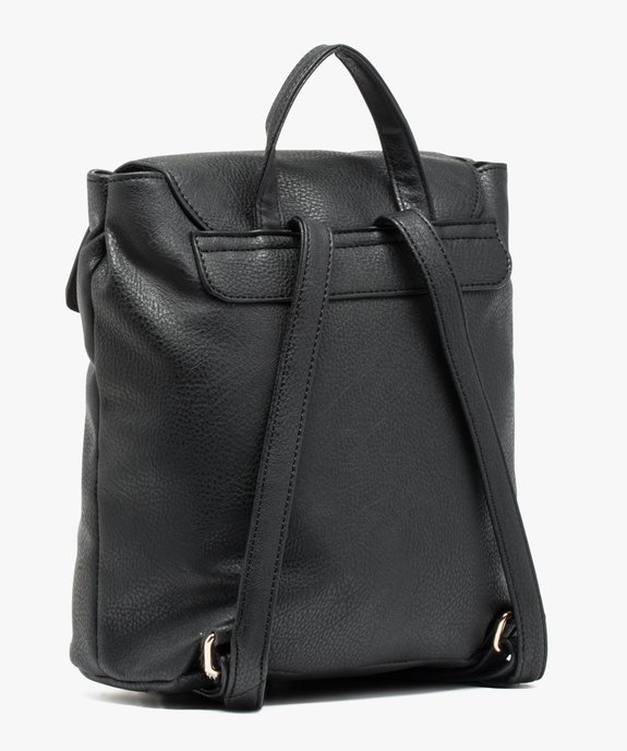 Élégance et praticité ! Ce sac pour femme conjugue le confort du sac à dos à l’élégance d’un sac à main de ville. Avec sa matière grainée et ses pièces métalliques finition dorée, il affiche un look élégant, classique et féminin. On aime la silhouette originale avec rabat aimanté et zips en biais. Le grand compartiment zippé cache une poche zippée et une poche ouverte. Devant, les deux petites poches zippées vous permettent d’accéder rapidement à vos clés, votre smartphone ou votre petite monnaie.