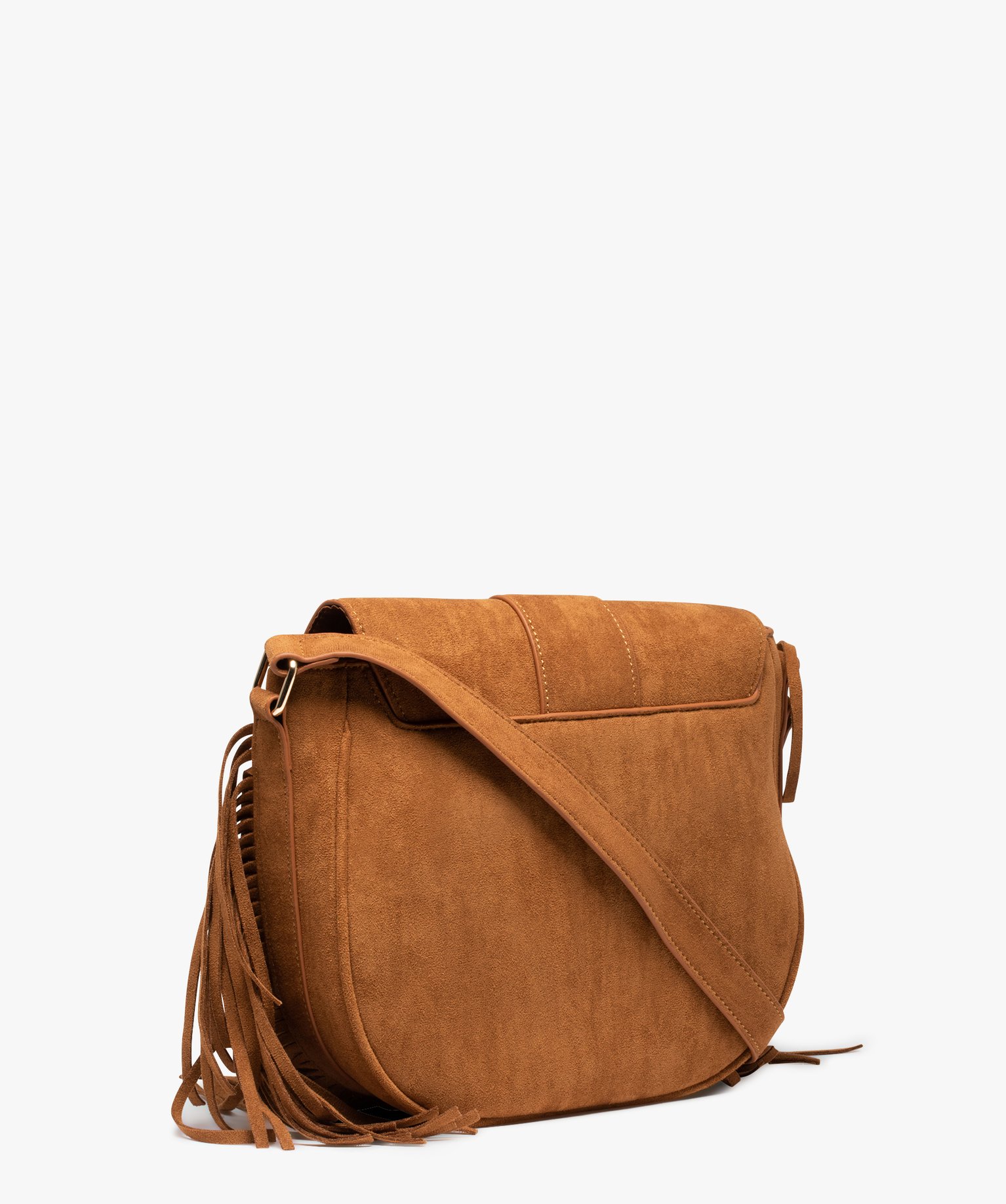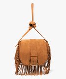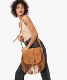 Un sac à bandoulière à intégrer dans tous les looks bohème de la saison. Confectionné dans une matière suédine, il est agrémenté de nombreuses franges qui lui donnent un esprit folk. Ce sac à main femme possède un large rabat orné d’une bande à boucle métallique avec fermeture par bouton aimanté. Il offre un grand compartiment zippé permettant de transporter vos essentiels du quotidien. Un sac besace à franges idéal pour apporter une touche folk à une robe longue.