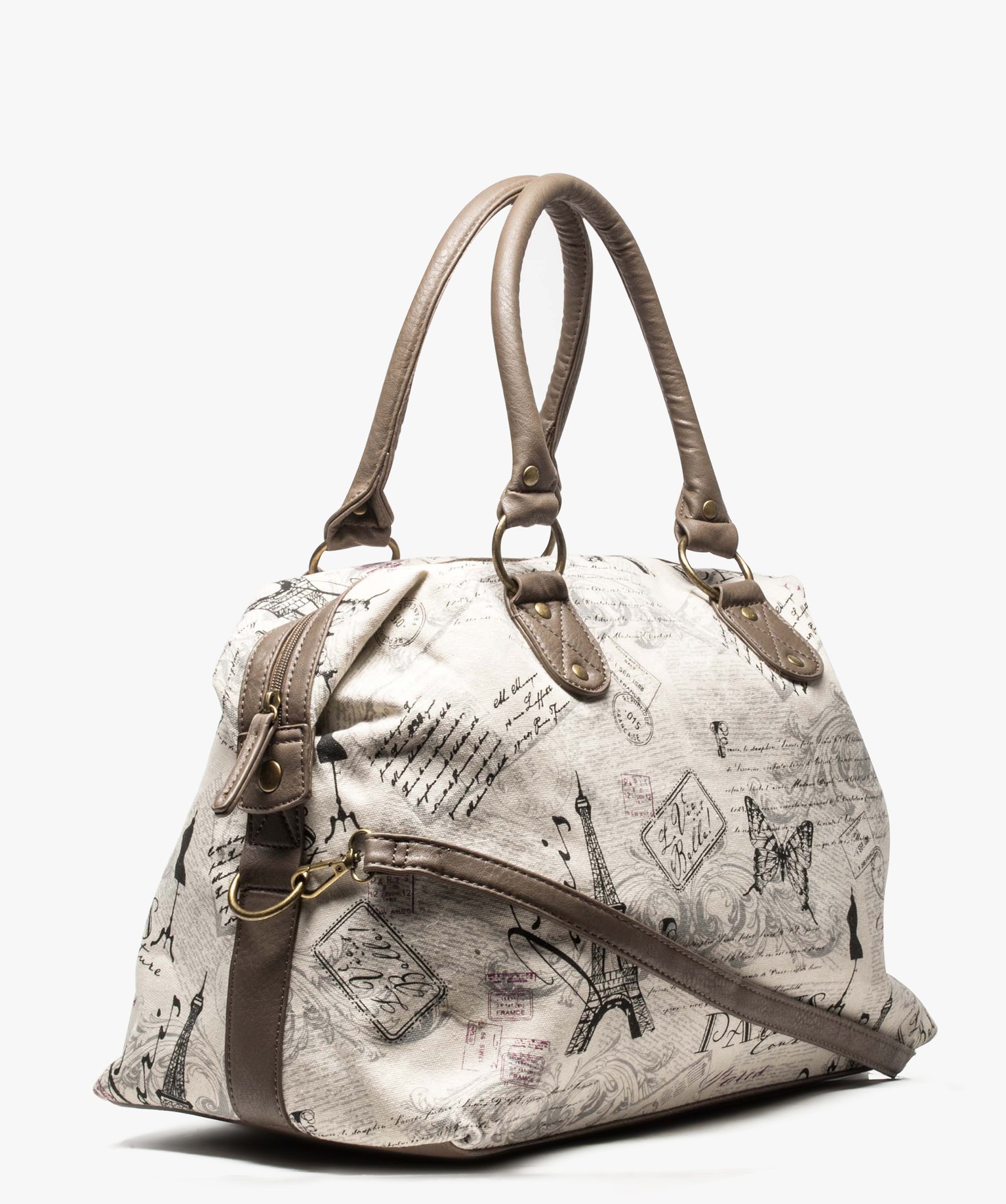 Ce sac week-end est idéal pour partir en week-end ou pour celles qui transportent chaque jour tout un tas de choses ! Dans son grand compartiment fermé par zip, on trouve une poche zippée et deux pochettes ouvertes. En textile épais, il est souple et solide. Le fond, les anses et le zip sont en faux-cuir. Vous pouvez le porter à la main grâce à deux anses ou à l’épaule grâce à une bandoulière réglable amovible.