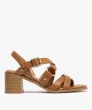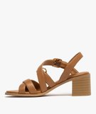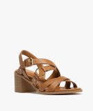 Envie d’une paire de sandales élégantes et confortables pour trottiner toute la journée ? Ces sandales à talon sont celles qu’il vous faut ! Confectionnées en cuir imitation aspect grainé, ces sandales à brides croisées affichent une allure authentique rehaussée de détails métalliques. Les brides souples, associées à une semelle intérieure moussée, offrent un confort exceptionnel. Ces sandales femme se ferment à l’aide d’une boucle dissimulant un élastique et possèdent un large talon stable. Des sandales faciles à marier avec l’intégralité du dressing.