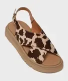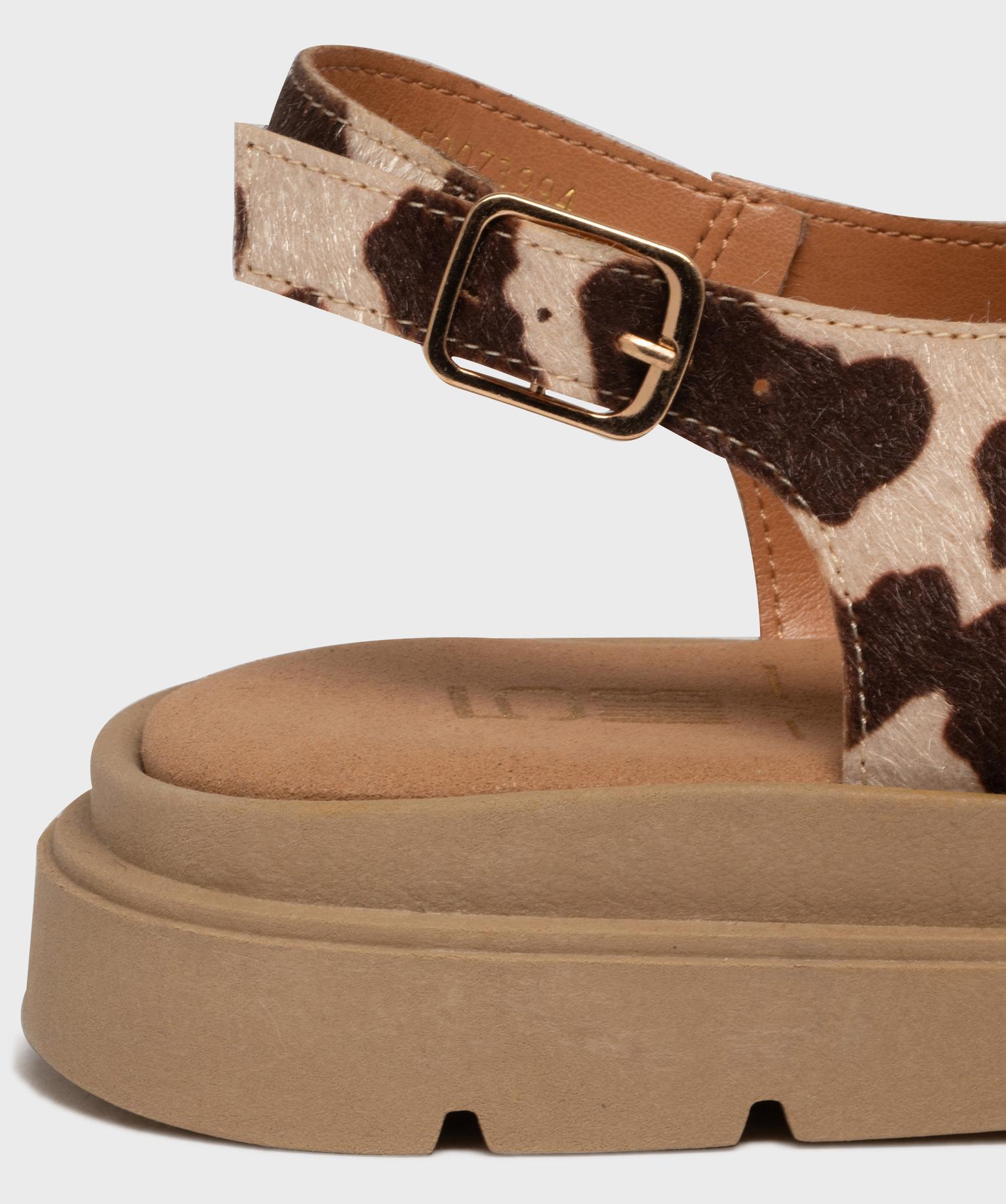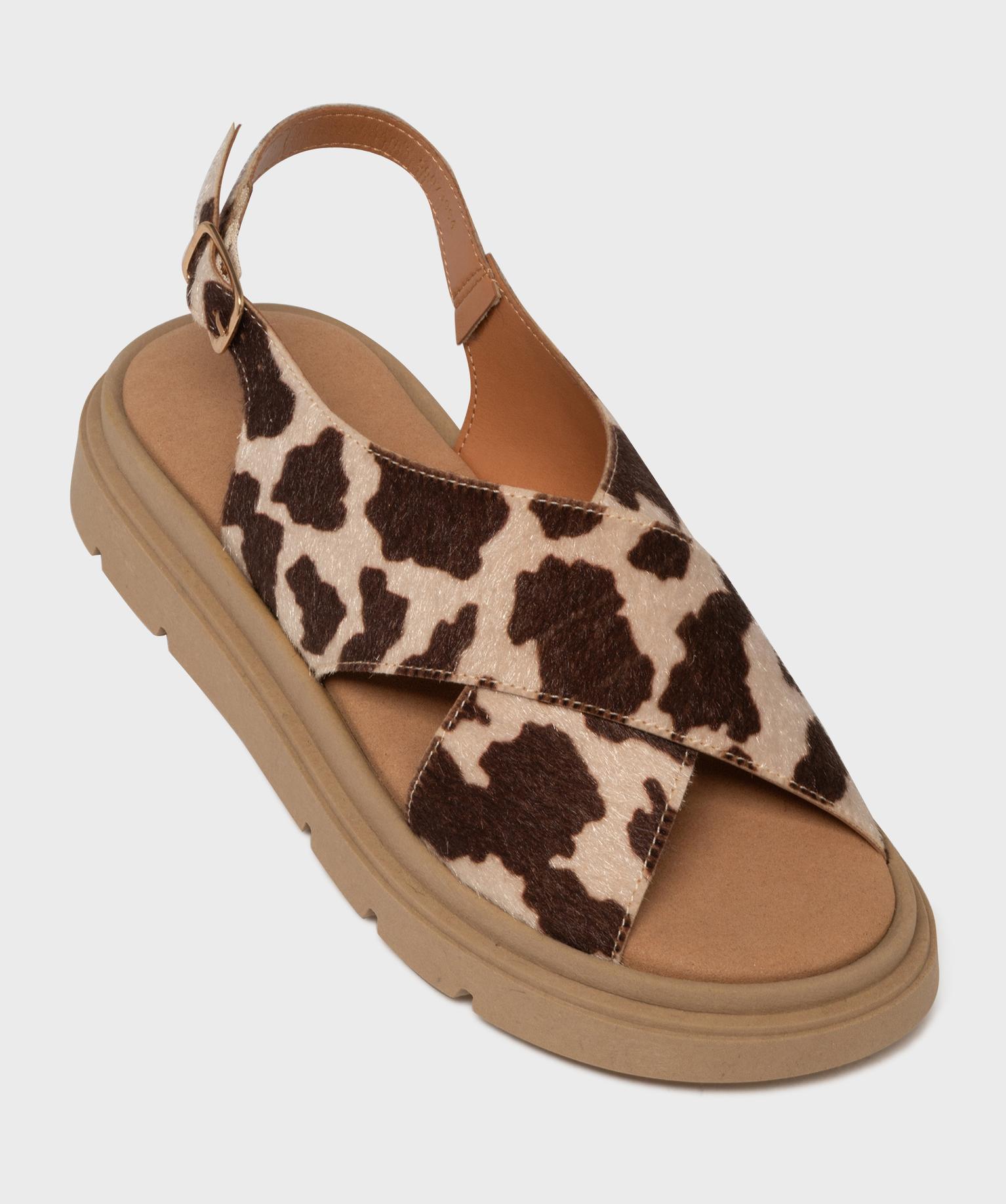 Ces sandales épaisses au motif animalier insufflent un vent de caractère à la silhouette. Le dessus, composé de larges brides croisées pelage vache imitation, attire le regard avec un style authentique et singulier. La bride cheville réglable garantit un maintien confortable. La semelle intérieure est moelleuse pour votre confort de marche. Ces sandales femme se marient parfaitement avec une robe chemise ceinturée, un pantalon large en toile ou un short taille haute.