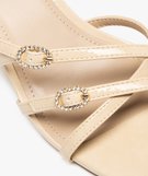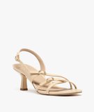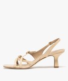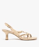Ces sandales à talon ajouteront une irrésistible touche glamour à vos tenues. Des sandales femme qui subliment le pied grâce à un jeu de fines brides fermées par de jolies boucles à strass sur le dessus et sur le côté de la cheville. Elles reposent sur une semelle fine à bout carré et un talon fin très contemporain. Des sandales à porter comme chaussures de cérémonie ou pour faire scintiller les looks du quotidien.