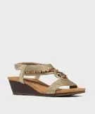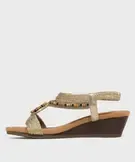 Sandales à talon compensé à brides tressées et perlées femme dore